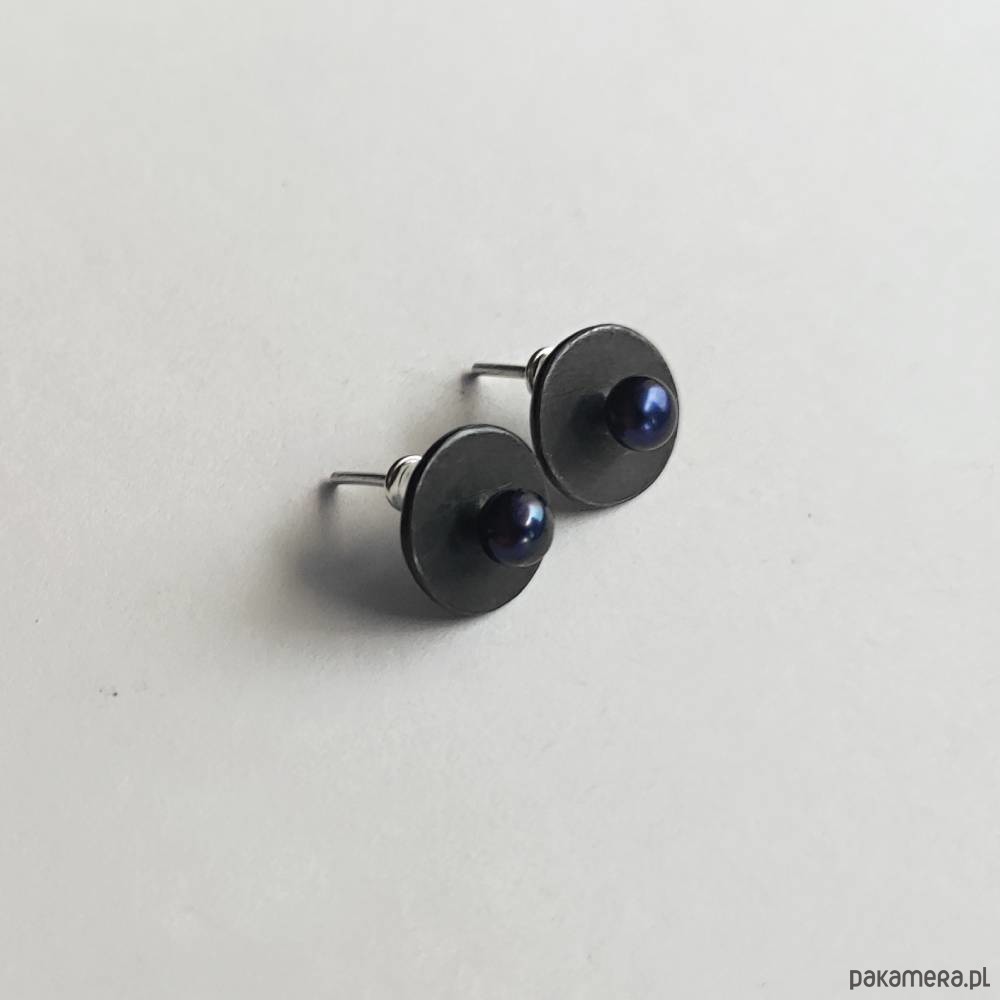 Oryginalność i prostota. OKRĄG - kształt doskonały. Kolekcję cechuje elegancja i prostota jak również ekstrawagancja i indywidualizm. Kolczyki na sztyftach wykonane są z : srebro, Perła czarna ( 0k 5 mm)Srebro - próby 0,925, zmatowione, oksydowane. Długość kolczyków - ok. 1,2cm