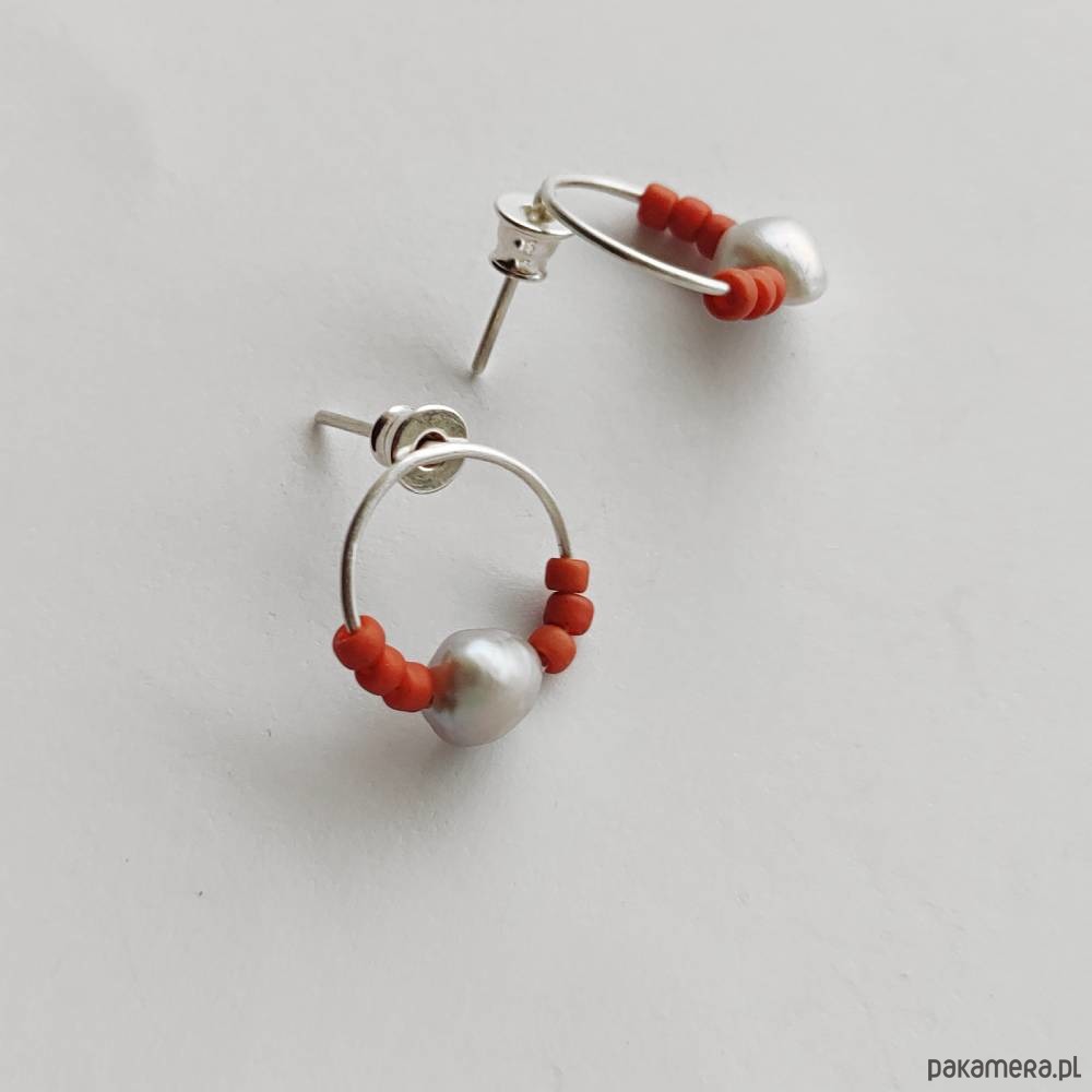 Oryginalność i prostota. OKRĄG - kształt doskonały. Kolekcję cechuje elegancja i prostota jak również ekstrawagancja i indywidualizm. Kolczyki na sztyftach wykonane są z - srebro, perła słodkowodna - 0,8 cm, koraliki szklane Srebro - zmatowione. Szerokość ok. 1,5 cm.
