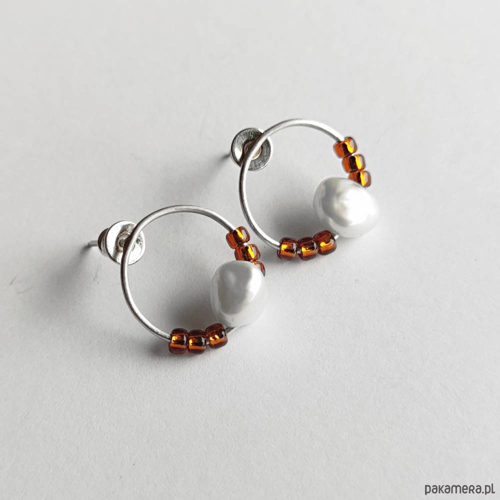Oryginalność i prostota. OKRĄG – kształt doskonały. Kolekcję cechuje elegancja i prostota jak również ekstrawagancja i indywidualizm. Kolczyki na sztyftach wykonane są z – srebro, perła hodowlana – 0,8 cm, koraliki szklane Srebro – zmatowione. Szerokość ok. 1,5 cm.