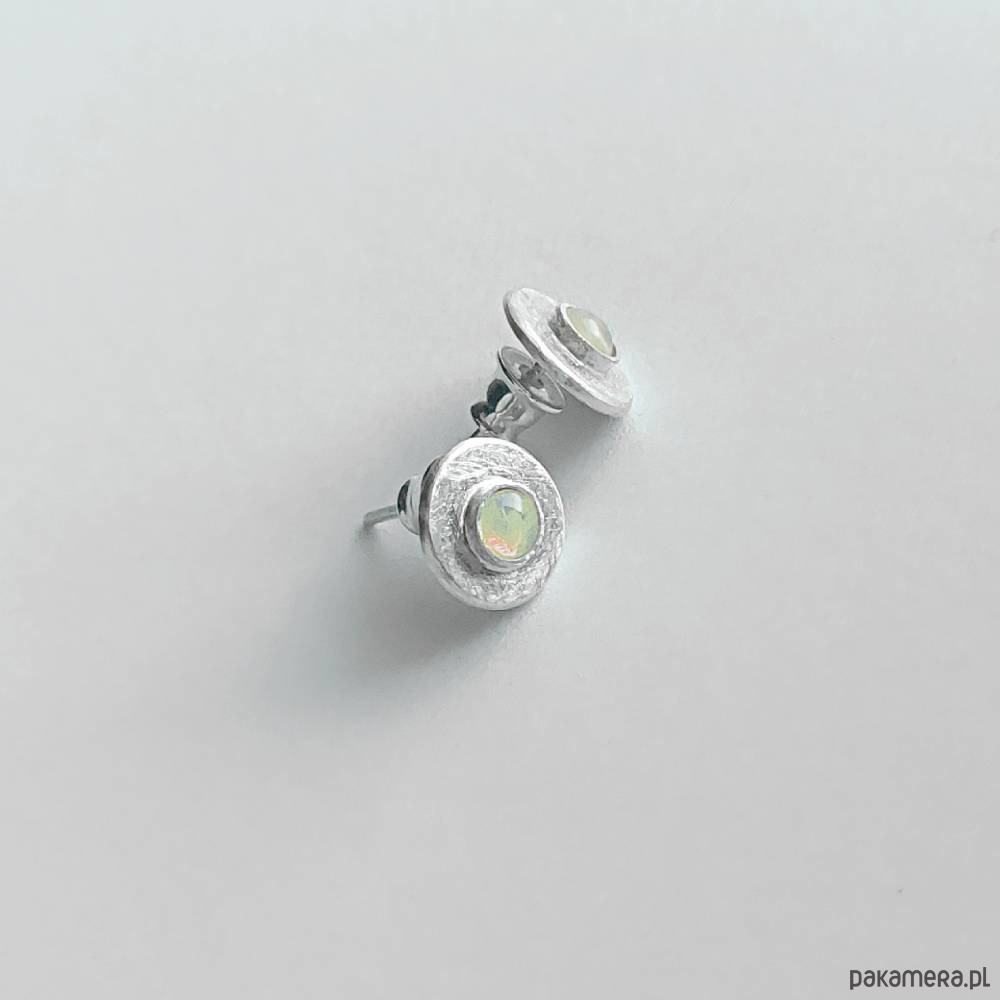 Oryginalność i prostota. OKRĄG – kształt doskonały. Kolekcję cechuje elegancja i prostota jak również ekstrawagancja i indywidualizm. Kolczyki na sztyftach wykonane są z : srebro, opal ( ok 4mm) Srebro – próby ,925 zmatowione. Długość kolczyków – ok. 1cm