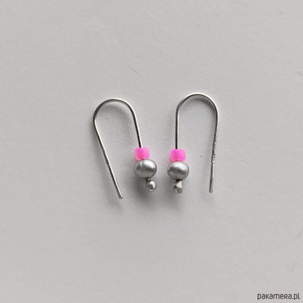 Oryginalność i prostota. OKRĄG - kształt doskonały. Kolekcję cechuje elegancja i prostota jak również ekstrawagancja i indywidualizm. Kolczyki wykonane są z - srebro, Perła słodkowodna srebrna oponka 5x3mm, szklane koraliki. Srebro - zmatowione. Długość ok 1,7 cm.