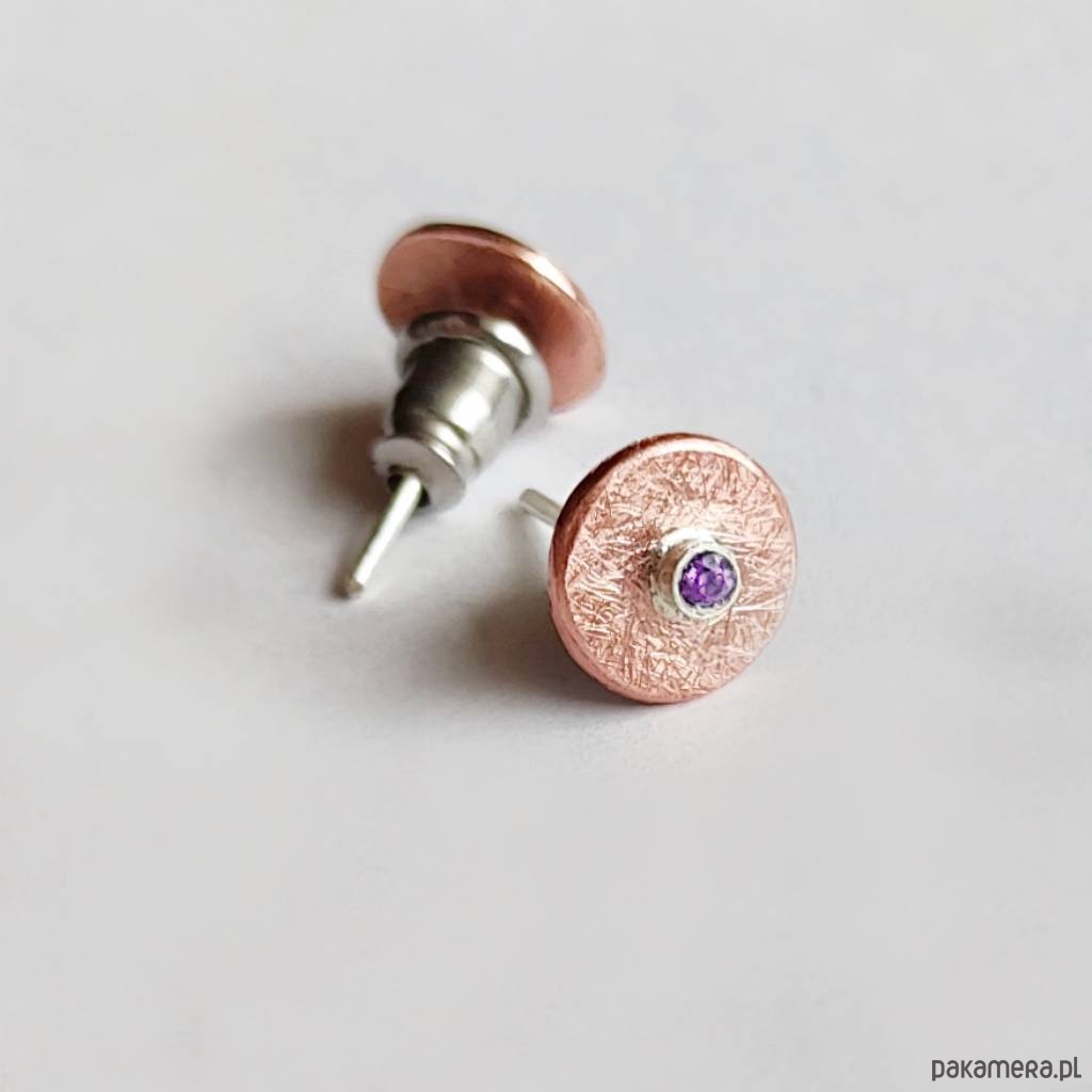 Oryginalność i prostota. OKRĄG - kształt doskonały. Kolekcję cechuje elegancja i prostota jak również ekstrawagancja i indywidualizm. Kolczyki na sztyftach wykonane są z : miedź, ametyst Srebro - próby 0,925, miedź - zmatowiony. Średnica kolczyka - 0,7 cm