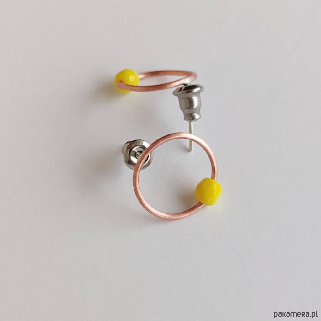 Oryginalność i prostota. OKRĄG - kształt doskonały. Kolekcję cechuje elegancja i prostota jak również ekstrawagancja i indywidualizm. Kolczyki na sztyftach wykonane są z - srebro, miedź, koraliki czeskie - 0,4 cm Srebro - zmatowione. Szerokość ok. 1,2 cm.