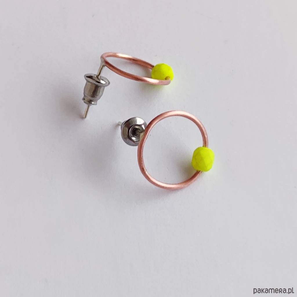 Oryginalność i prostota. OKRĄG - kształt doskonały. Kolekcję cechuje elegancja i prostota jak również ekstrawagancja i indywidualizm. Kolczyki na sztyftach wykonane są z - srebro, miedź, koraliki czeskie - 0,4 cm Srebro - zmatowione. Szerokość ok. 1,2 cm.