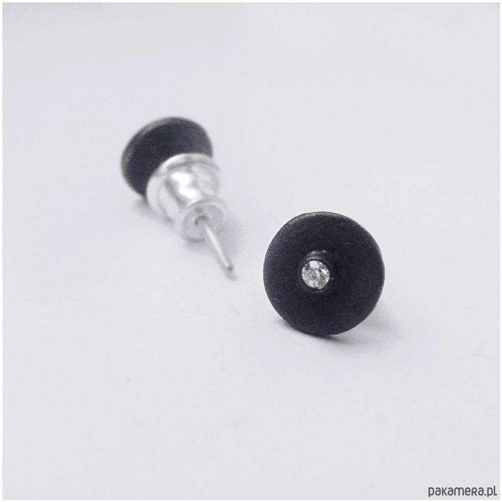 Oryginalność i prostota. OKRĄG - kształt doskonały. Kolekcję cechuje elegancja i prostota jak również ekstrawagancja i indywidualizm. Kolczyki na sztyftach wykonane są ze srebro, cyrkonia. Srebro - próby 0,925, zmatowione, oksydowane. Średnica kolczyka - 0,7 cm