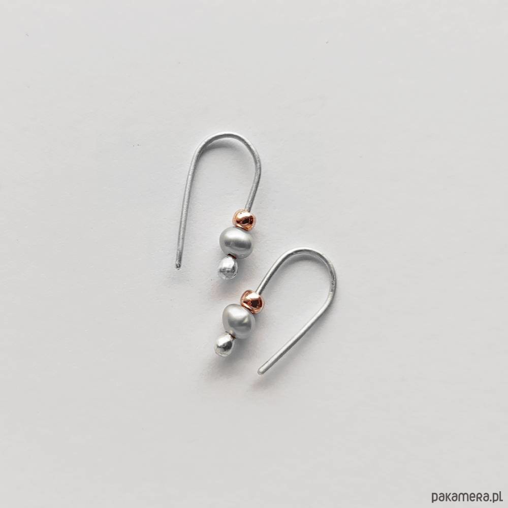 Oryginalność i prostota. OKRĄG - kształt doskonały. Kolekcję cechuje elegancja i prostota jak również ekstrawagancja i indywidualizm. Kolczyki wykonane są z - srebro, Perła słodkowodna srebrna oponka 5x3mm, szklane koraliki. Srebro - zmatowione. Długość ok 1,7 cm.