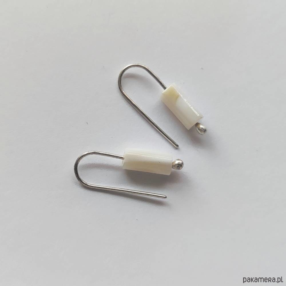 Oryginalność i prostota. OKRĄG - kształt doskonały. Kolekcję cechuje elegancja i prostota jak również ekstrawagancja i indywidualizm. Kolczyki wykonane są ze srebro, koraliki z masy perłowej - wałki 4.5x9,5-10mm Srebro - próby 0,925, zmatowione . Długość kolczyków - ok. 2 cm