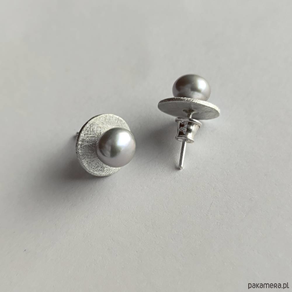 Oryginalność i prostota. OKRĄG - kształt doskonały. Kolekcję cechuje elegancja i prostota jak również ekstrawagancja i indywidualizm. Kolczyki na sztyftach wykonane są z : srebro, Perła szara( 0k 0,8 cm)Srebro - próby 0,925, zmatowione, . Długość kolczyków - ok. 1,2cm