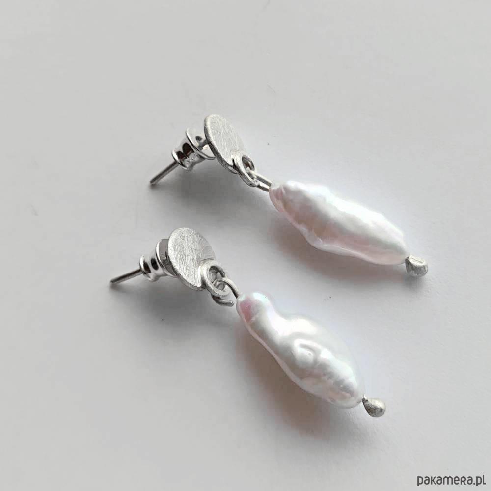 Oryginalność i prostota. OKRĄG - kształt doskonały. Kolekcję cechuje elegancja i prostota jak również ekstrawagancja i indywidualizm. Kolczyki na sztyftach wykonane są z : srebro, Perła hodowlana ( 1,3-2 X - 0,5-0.9cm )Srebro - próby 0,925, zmatowione, . Długość kolczyków - ok. 3,5 cm