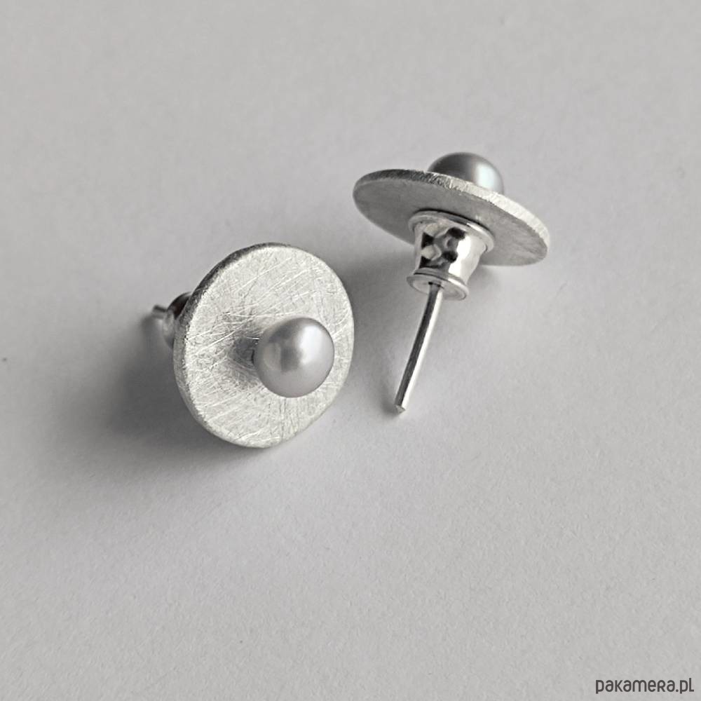 Oryginalność i prostota. OKRĄG - kształt doskonały. Kolekcję cechuje elegancja i prostota jak również ekstrawagancja i indywidualizm. Kolczyki na sztyftach wykonane są z : srebro, Perła szara( 0k 0,4 cm)Srebro - próby 0,925, zmatowione, . Długość kolczyków - ok. 1,2cm