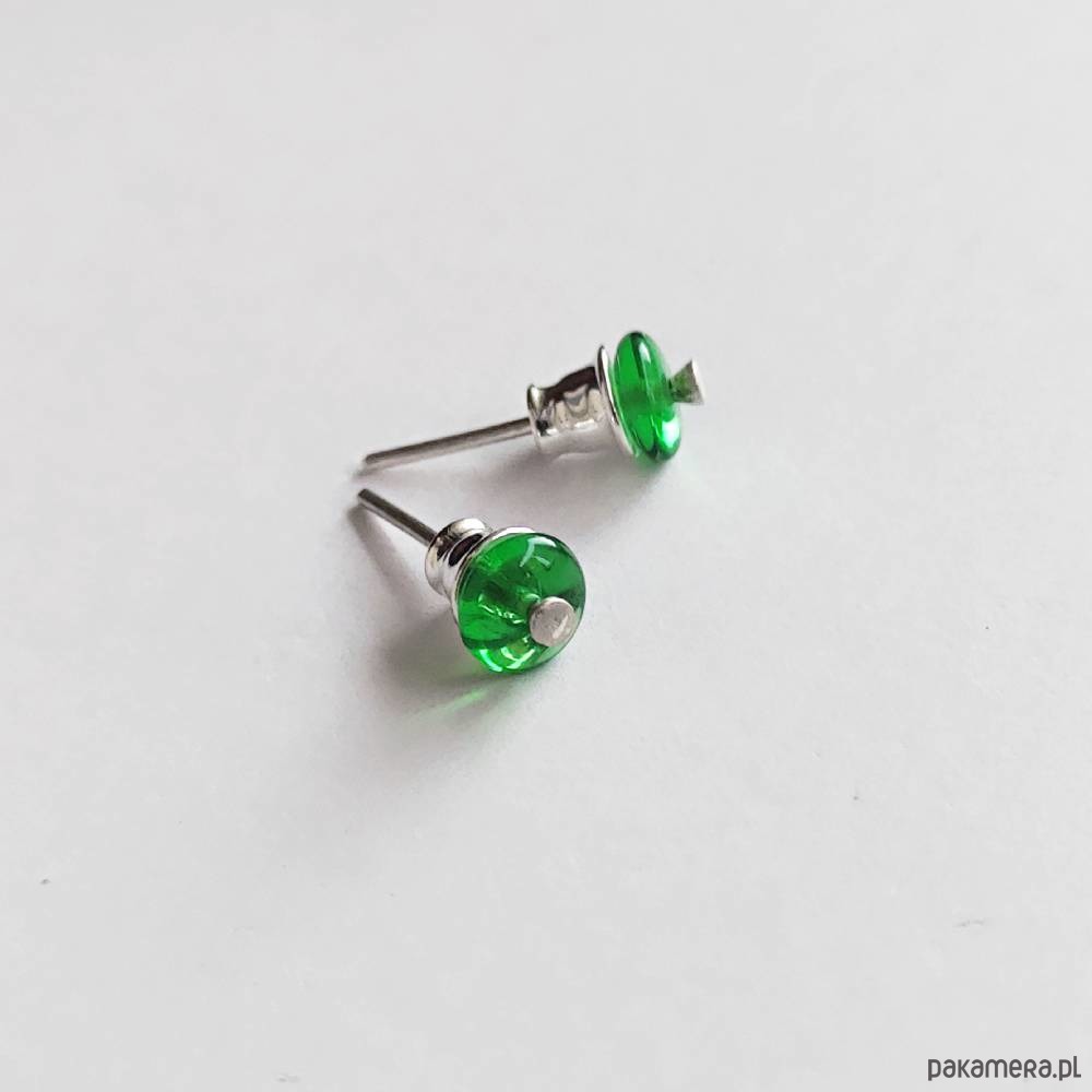 Oryginalność i prostota. OKRĄG - kształt doskonały. Kolekcję cechuje elegancja i prostota jak również ekstrawagancja i indywidualizm. Kolczyki na sztyftach wykonane są ze srebro, Szklane guziczki zielone 6mm. Srebro - próby 0,925, zmatowione.