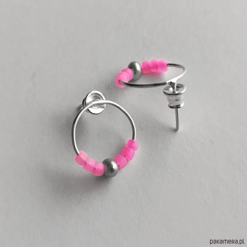 Oryginalność i prostota. OKRĄG - kształt doskonały. Kolekcję cechuje elegancja i prostota jak również ekstrawagancja i indywidualizm. Kolczyki na sztyftach wykonane są z - srebro,Perła słodkowodna srebrna oponka 5x3mm,szklane koraliki. Srebro - zmatowione. Szerokość ok. 1,5 cm.