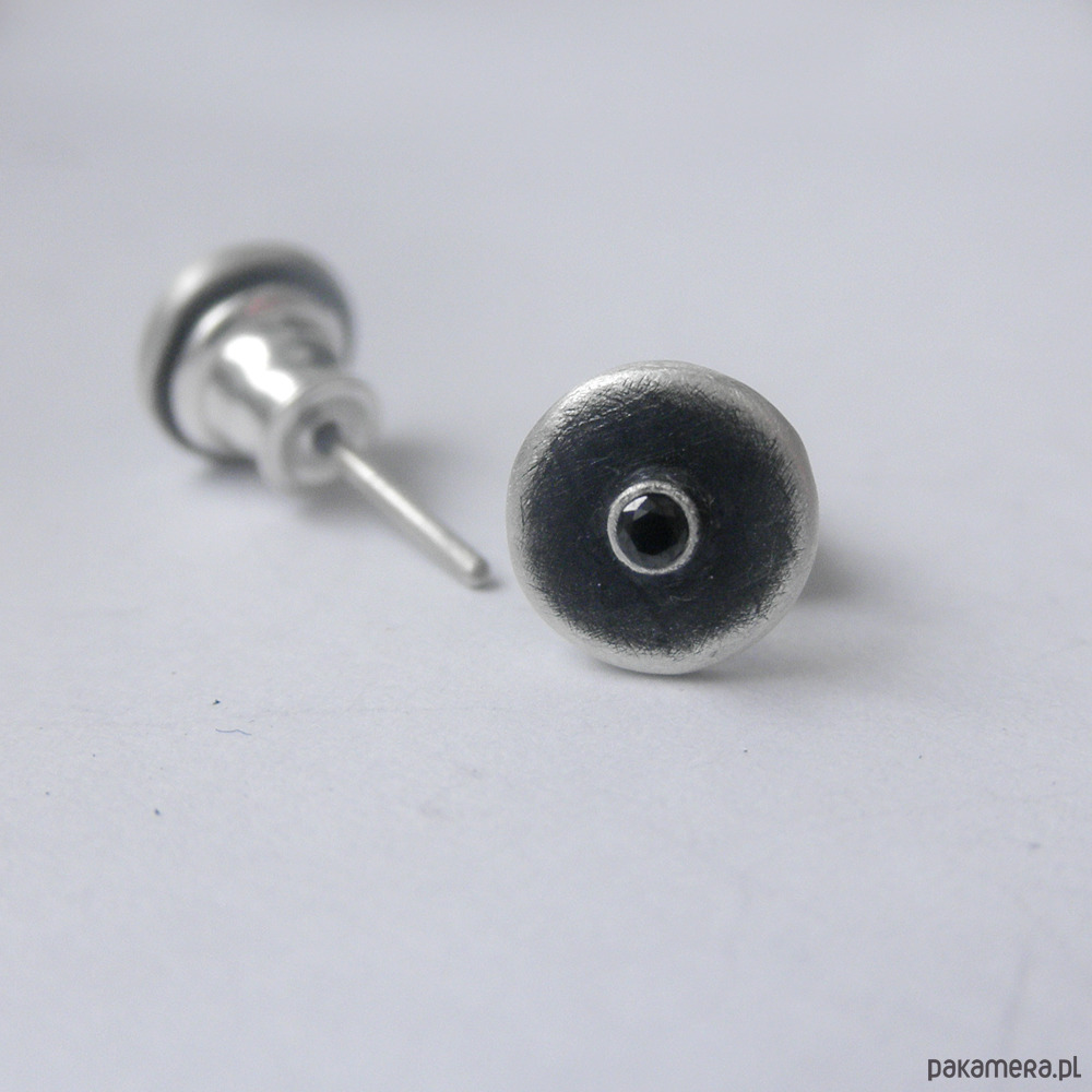 Oryginalność i prostota. OKRĄG - kształt doskonały. Kolekcję cechuje elegancja i prostota jak również ekstrawagancja i indywidualizm. Kolczyki na sztyftach wykonane są ze srebro, cyrkonia. Srebro - próby 0,925, zmatowione, oksydowane. Średnica kolczyka - 0,7 cm