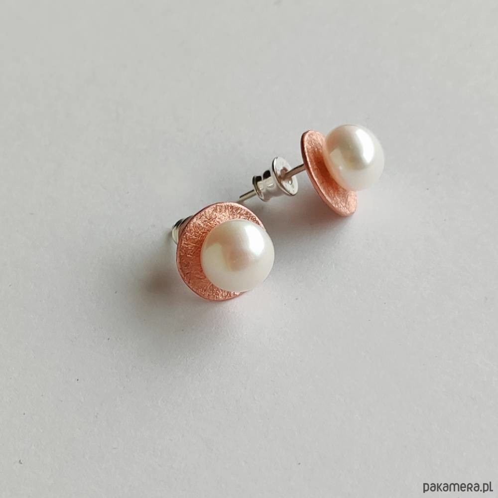 Oryginalność i prostota. OKRĄG - kształt doskonały. Kolekcję cechuje elegancja i prostota jak również ekstrawagancja i indywidualizm. Kolczyki na sztyftach wykonane są z : srebro, Perła różowa ( 0k 7,5 mm)Srebro - próby 0,925,miedź - zmatowiona, . Długość kolczyków - ok. 1,2cm