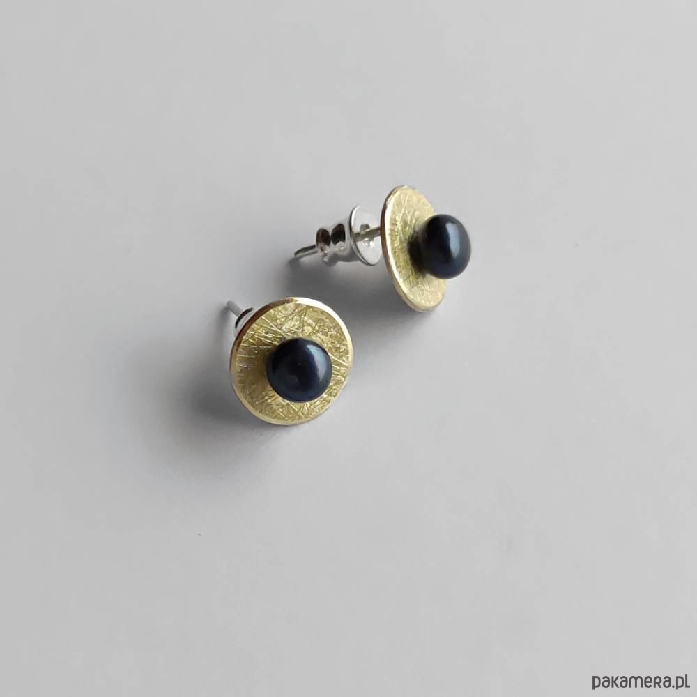 Oryginalność i prostota. OKRĄG – kształt doskonały. Kolekcję cechuje elegancja i prostota jak również ekstrawagancja i indywidualizm. Kolczyki na sztyftach wykonane są z :mosiądz, srebro, Perła granatowa( ok 6- 6,5mm) Mosiądz- zmatowiony. Srebro – próby ,925, zmatowione, . Długość kolczyków – ok. 1cm