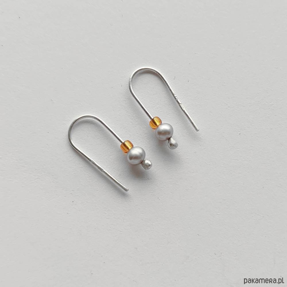 OKRĄG kolczyki. Oryginalność i prostota. OKRĄG - kształt doskonały. Kolekcję cechuje elegancja i prostota jak również ekstrawagancja i indywidualizm. Kolczyki wykonane są ręcznie z - srebro, Perła słodkowodna srebrna oponka 5x3mm, szklane koraliki. Srebro - zmatowione. Długość ok 1,7 cm.