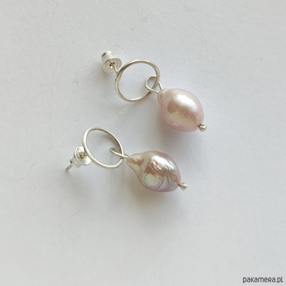 OKRĄG kolczyki Oryginalność i prostota. OKRĄG – kształt doskonały. Kolekcję cechuje elegancja i prostota jak również ekstrawagancja i indywidualizm. Kolczyki wykonane są ręcznie z : srebro, perła słodkowodna różowa 15 mm. Srebro – próby 0,925, zmatowione. Długość kolczyków – ok. 2,7 cm