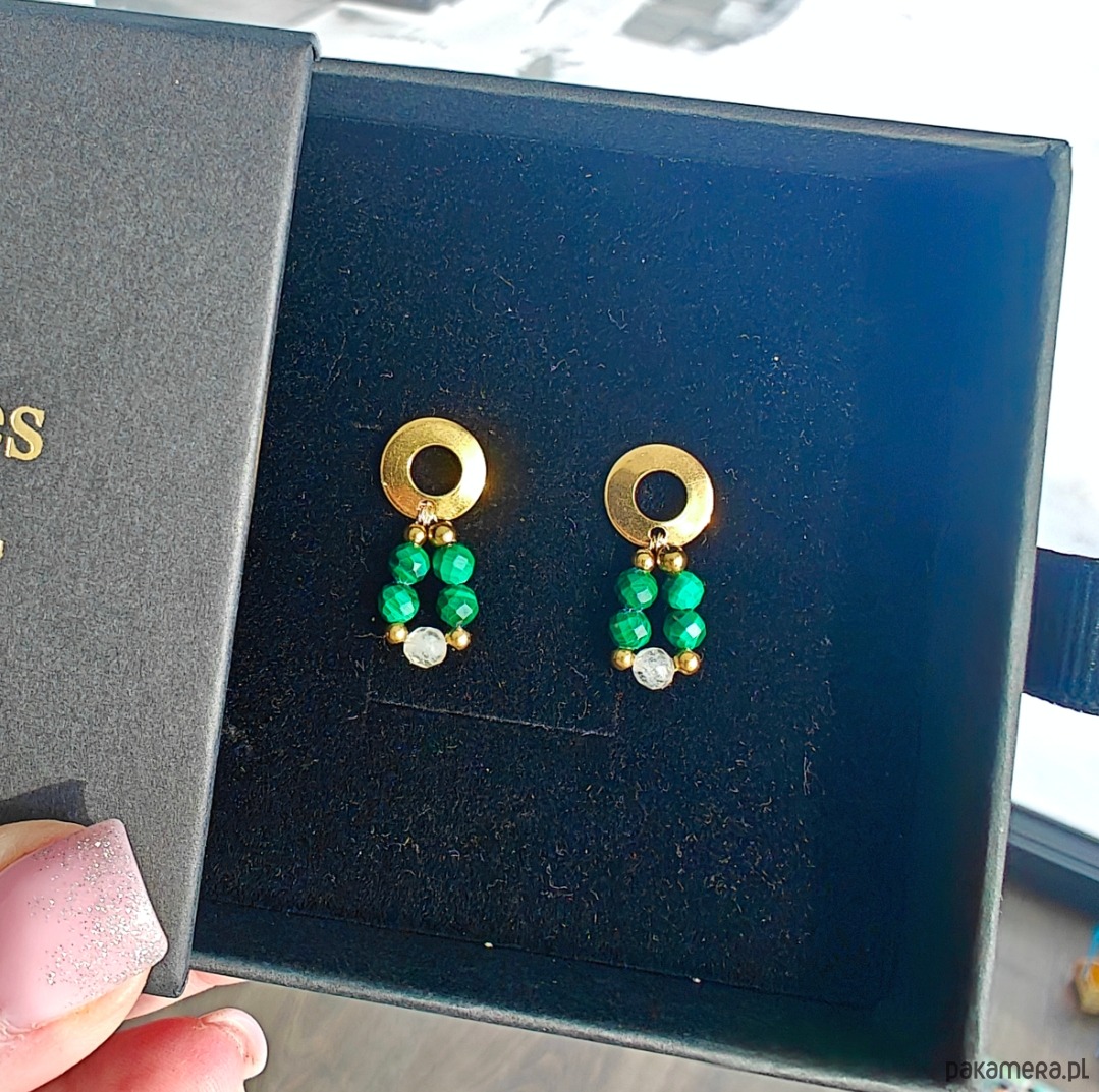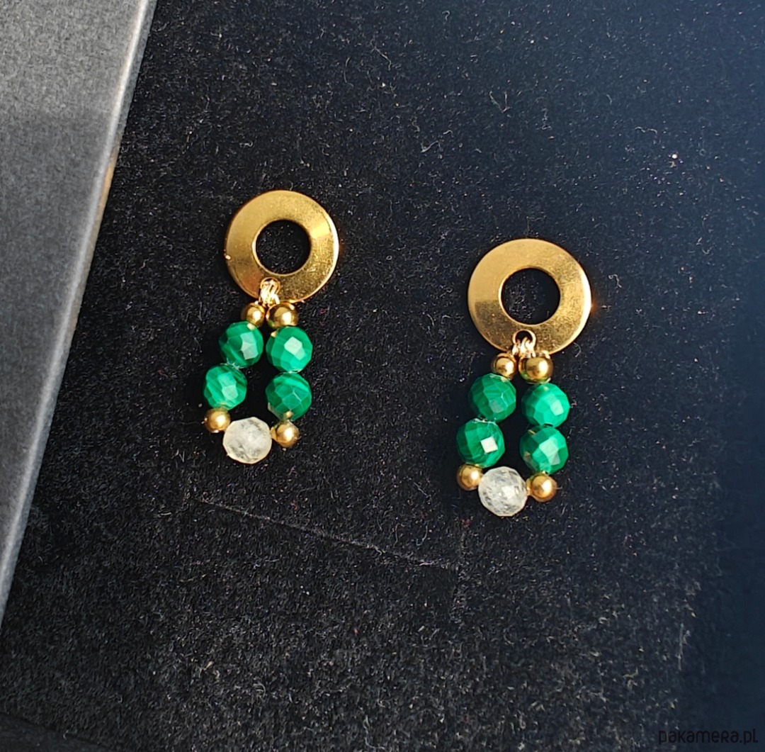 Kolczyki wykonane na okrągłej bazie ze stali chirurgicznej w kolorze złota, zapinane na sztyft. Kompozycja została stworzona na druciku z naturalnych kamieni: malachitu oraz cytrynu, uzupełnionych kulkami ze stali chirurgicznej w kolorze złota. Kolczyki mają około 2 cm długości.