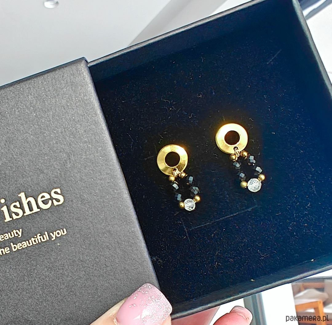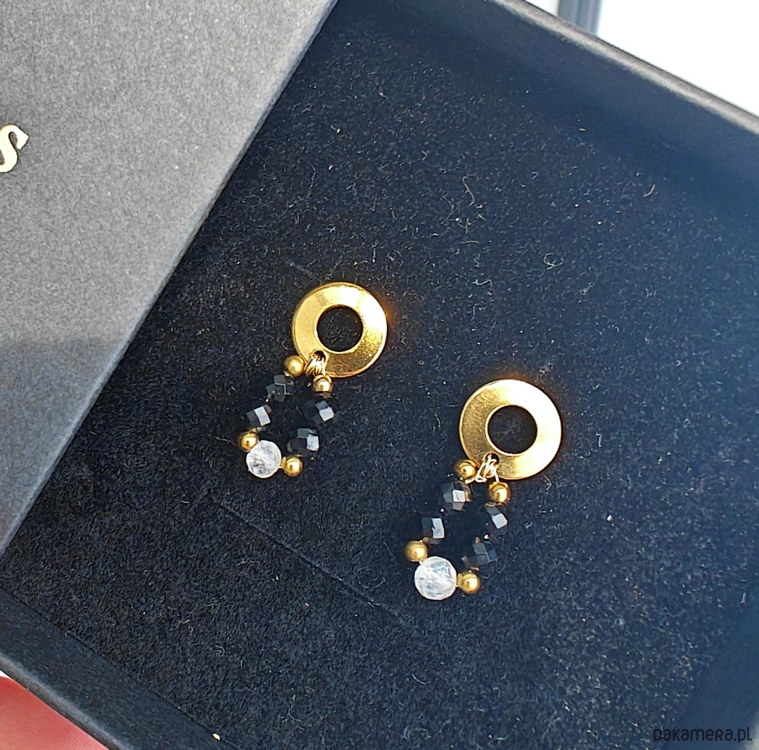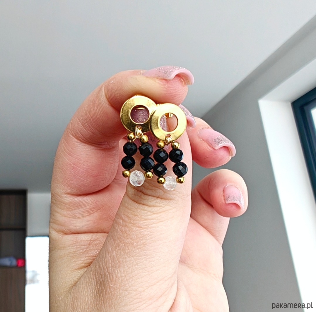 Kolczyki wykonane na okrągłej bazie ze stali chirurgicznej w kolorze złota, zapinane na sztyft. Kompozycja została stworzona na druciku z naturalnych kamieni: turmalinu oraz cytrynu, uzupełnionych kulkami ze stali chirurgicznej w kolorze złota. Kolczyki mają około 2 cm długości.