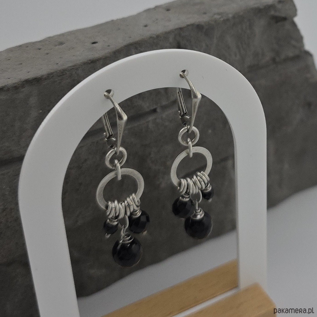 Kobiece, pełne uroku kolczyki wykonane w całości z oksydowanego srebra próby 925 oraz fasetowanych kulek onyksu wielkości 8, 6 i 4 mm. Wielkość kółeczek to 12,5 mm. Całkowita długość kolczyków to ok. 5,2 cm. Ozdobnie zapakowane.