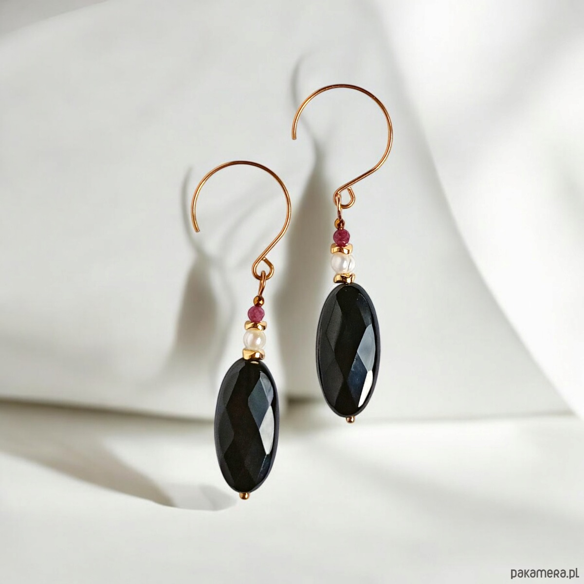 Wykonane z połączenia fasetowanego onyksu (aż 25mm!) i fasetowanego rubinu (3mm) oraz naturalnej perełki (5mm) i przekładek ze złotego hematytu.
