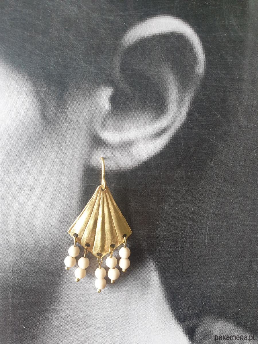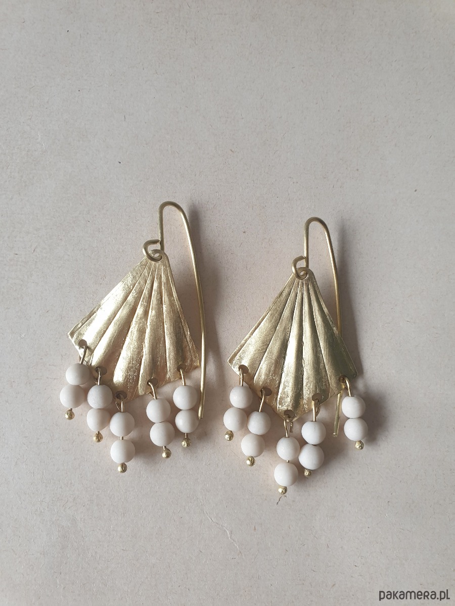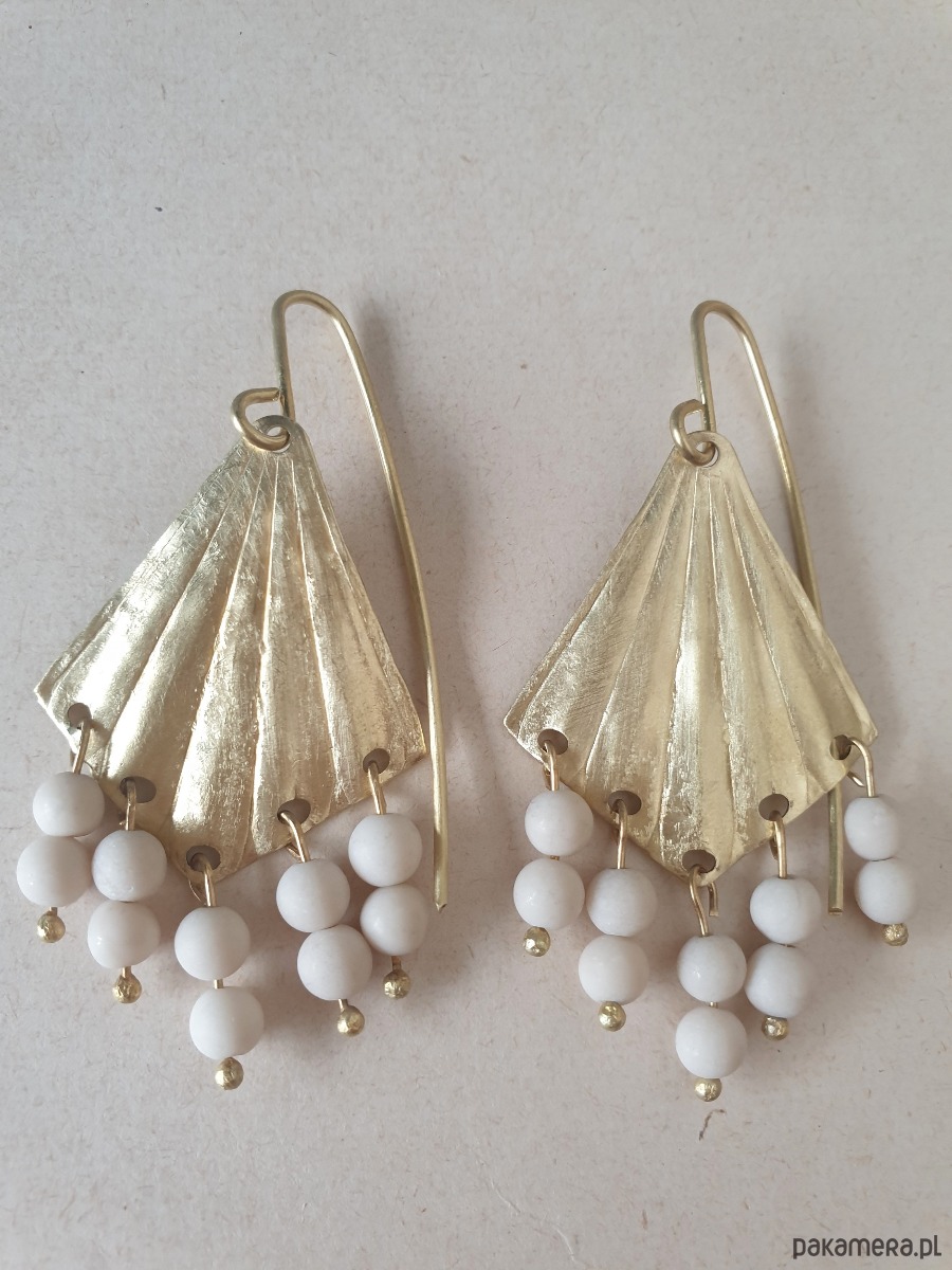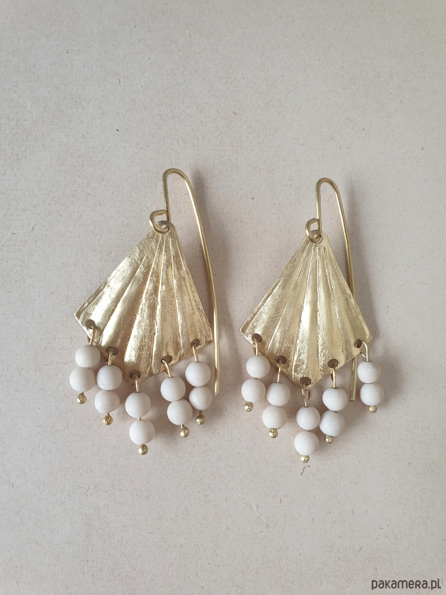Duże wiszące kolczyki z kolekcji ORIGAMI, w kształcie wachlarzy na długich sztyftach z surowego mosiądzu z kamieniami naturalnymi, kulkami jaspisu river (tzw kamień rzeczny). Kolczyki są ręcznie wycinane, młotkowane, matowione i formowane stąd ich niedoskonały urok i każda para jest wyjątkowa. Kolczyki tworzone na zamówienie, na zdjęciu przykładowa para.