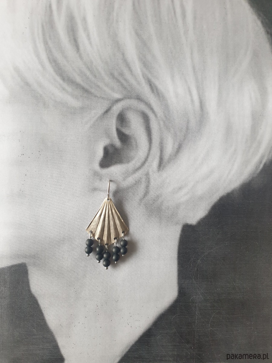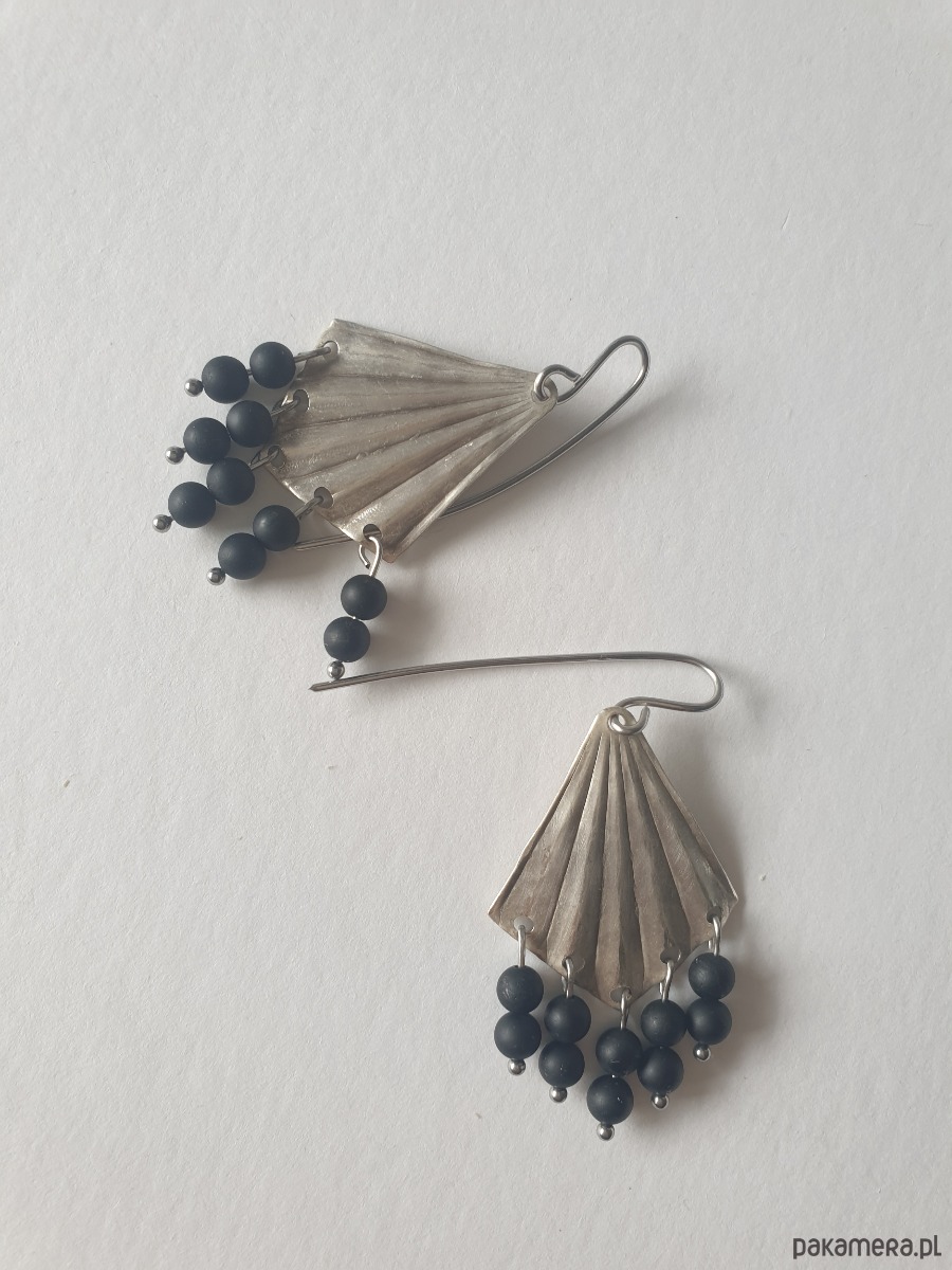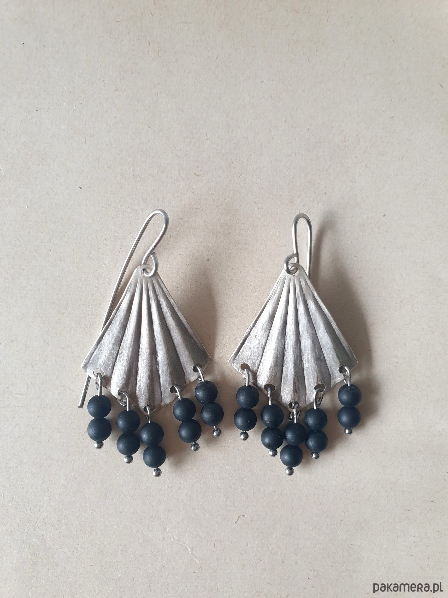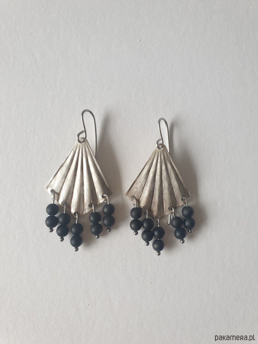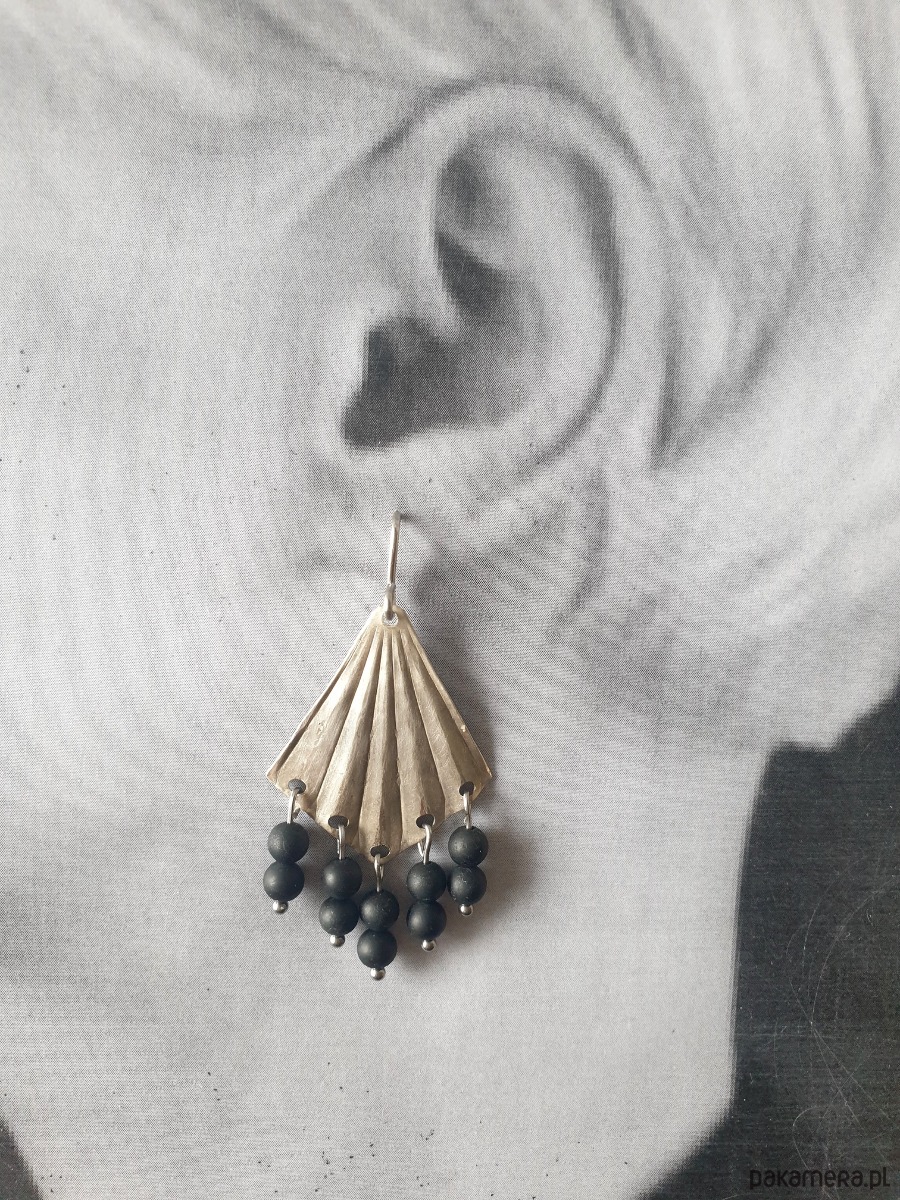 Kolczyki ORIGAMI wachlarze z czarnym turmalinem, mosiądz posrebrzany