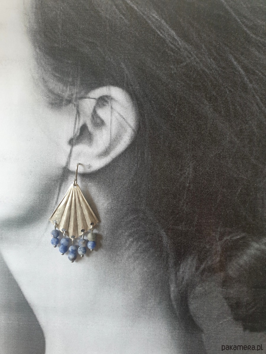 Duże wiszące kolczyki z kolekcji ORIGAMI, w kształcie wachlarzy z mosiądzu posrebrzanego na stare srebro, na długich sztyftach ze stali szlachetnej, z kamieniami naturalnymi: jaspisem niebieskim. Kolczyki są ręcznie wycinane, młotkowane, matowione i formowane stąd ich niedoskonały urok i każda para jest wyjątkowa. Kolczyki tworzone na zamówienie, na zdjęciu przykładowa para.