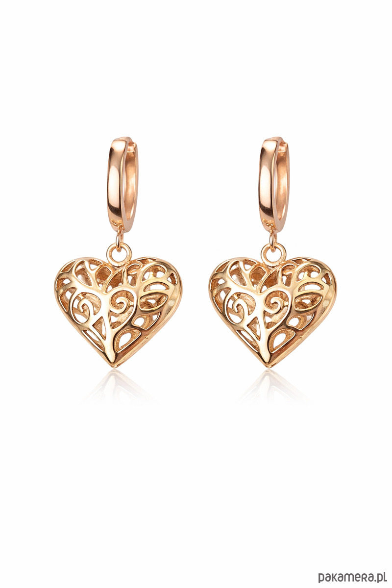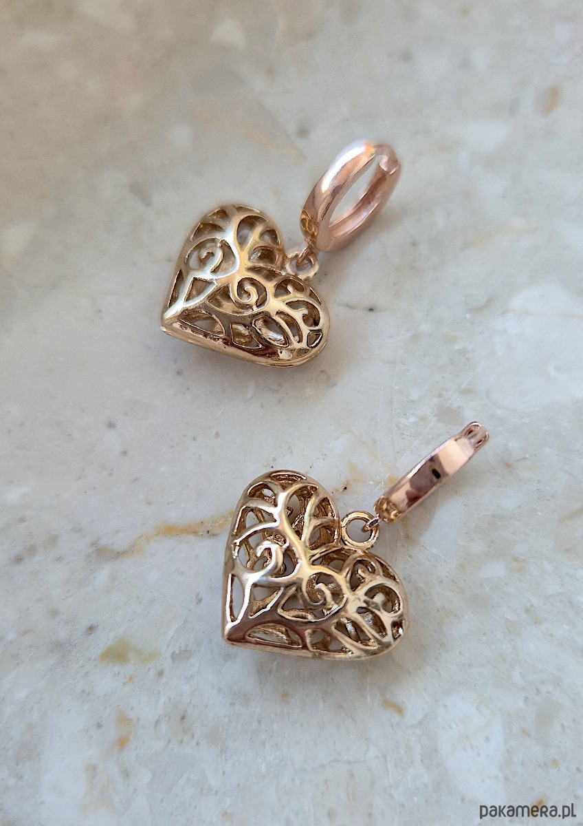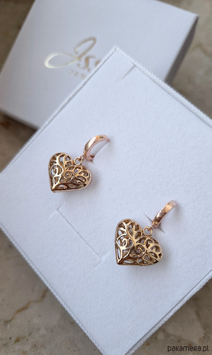 Efektowne kolczyki zapinane na bigiel angielski, wykonane ze srebra próby 925 pokrytego 18K różowym złotem ( bigle) oraz mosiądzu ( serca).