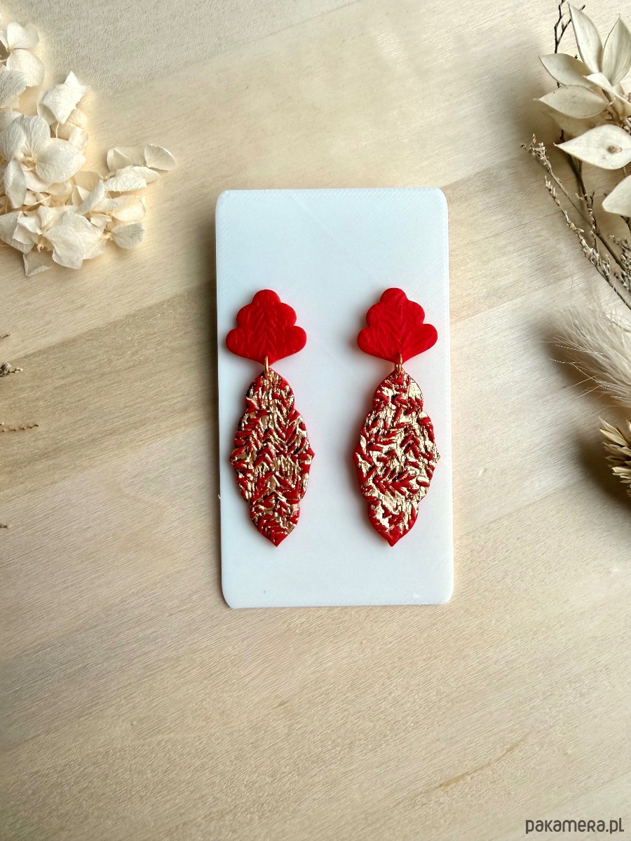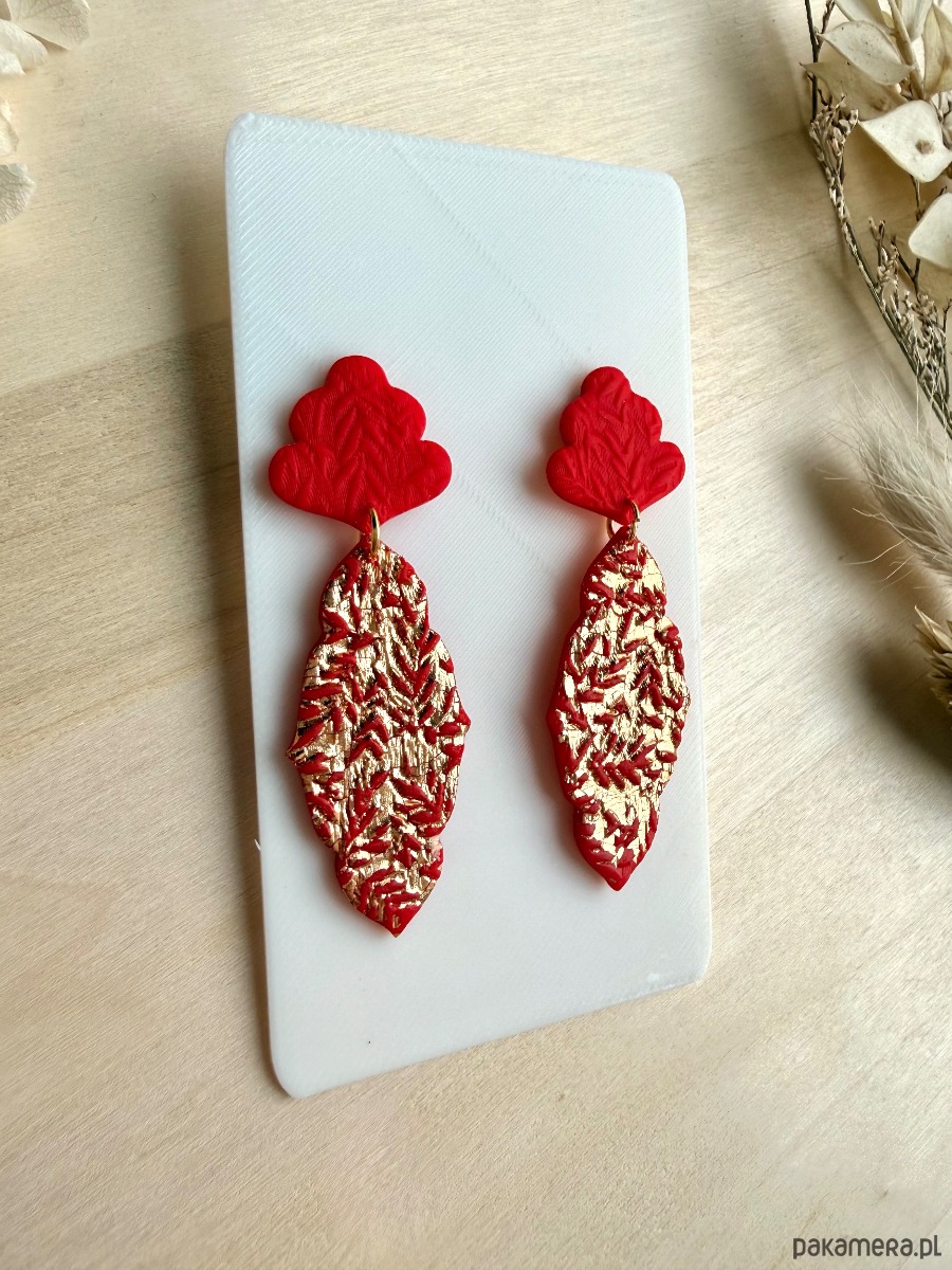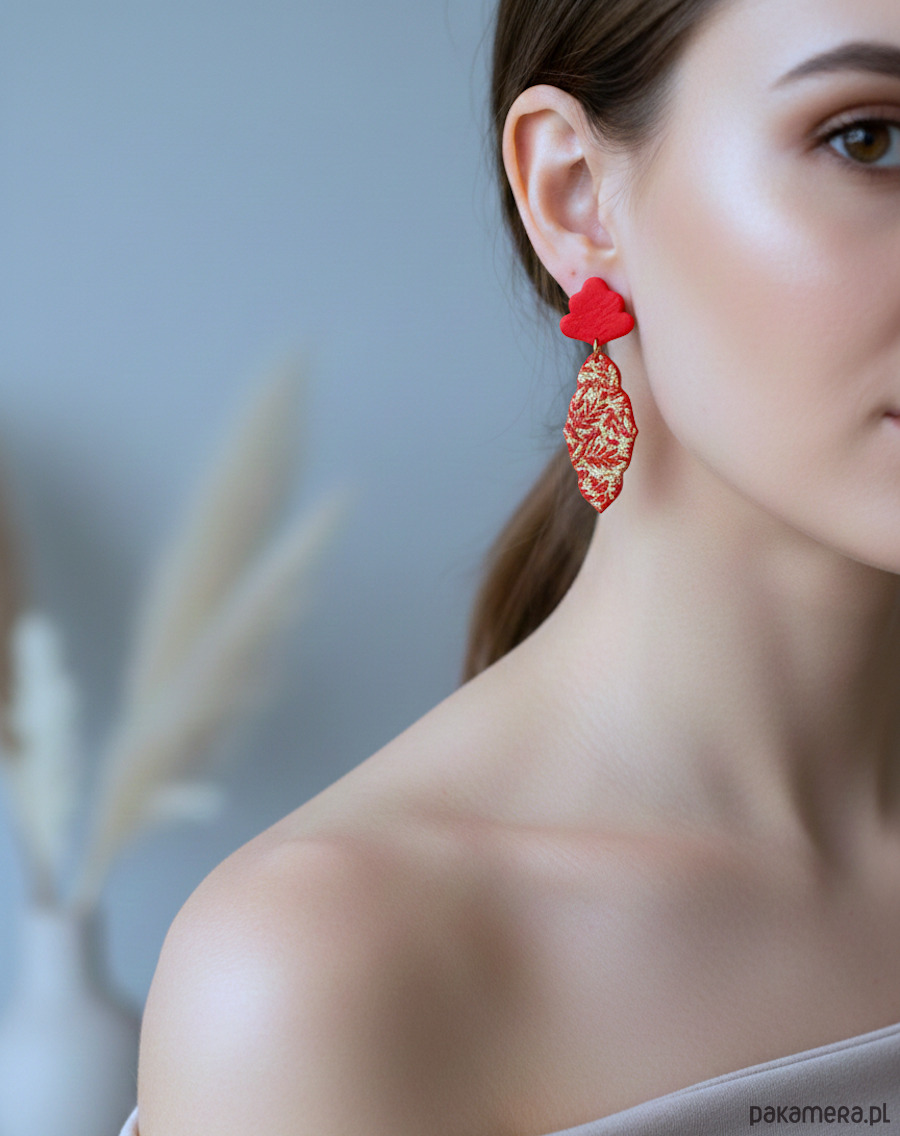 Podkreśl swój charakter wyrazistymi, ręcznie wykonanymi kolczykami w intensywnym odcieniu czerwieni! Połączenie złoconej, fakturowanej góry z dekoracyjnym, matowym liściem tworzy efektowną kompozycję, która pięknie wydłuża szyję i przyciąga wzrok przy każdym ruchu.