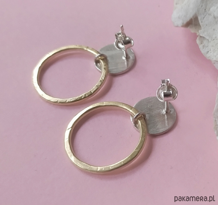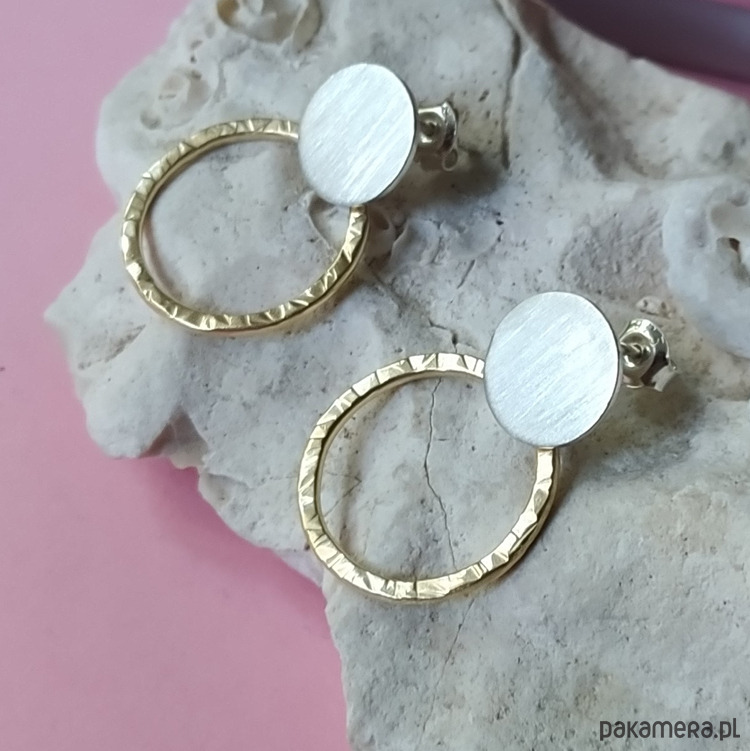 Powierzchnia jednego jest młotkowana i pozłocona 24K złotem,co sprawia że kolczyki mają ciekawą fakturę, natomiast drugiego zmatowiona (satynowa).