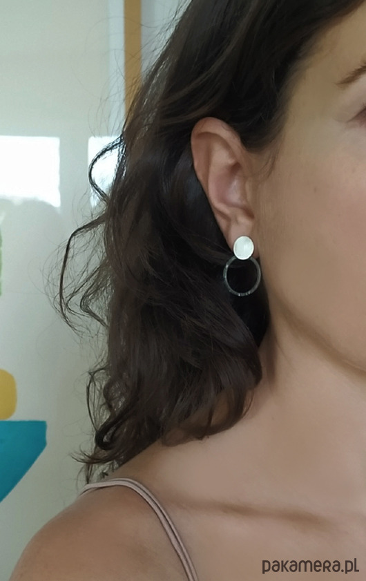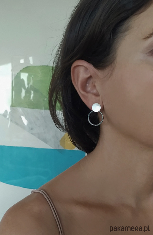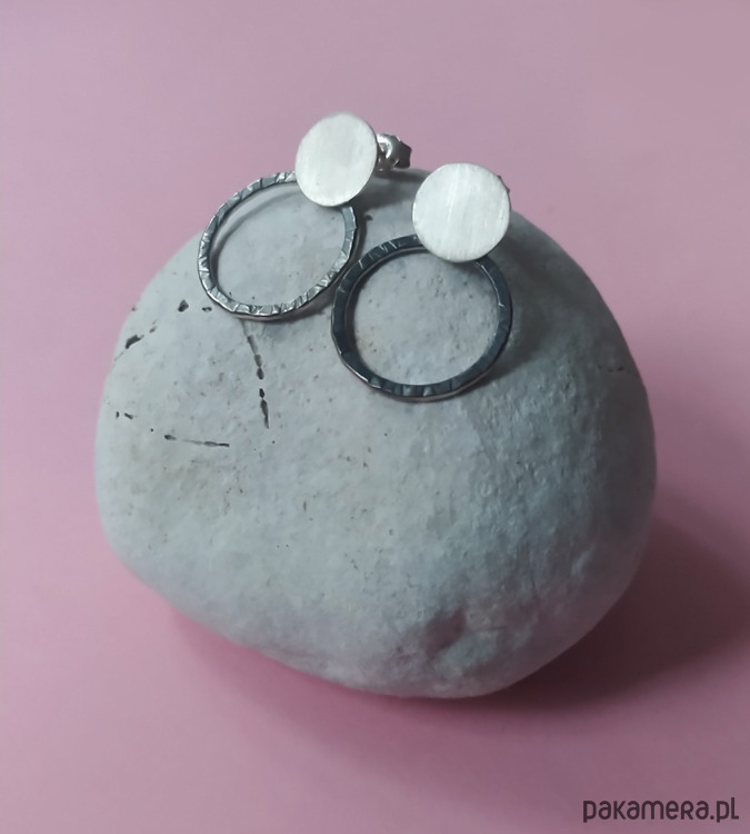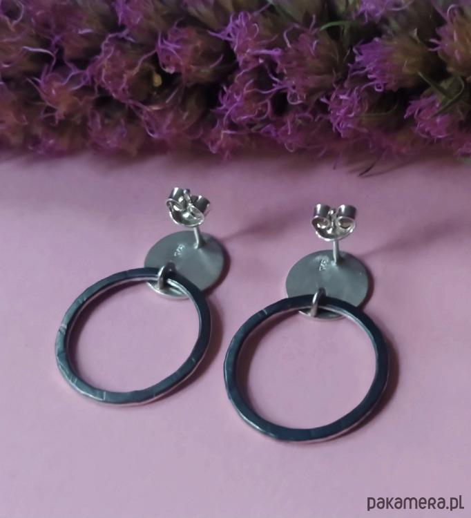 Powierzchnia jednego jest młotkowana i oksydowana (kolor czarny),co sprawia że kolczyki mają ciekawą fakturę, natomiast drugiego zmatowiona (satynowa).