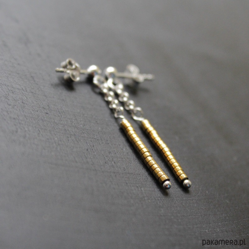 Delikatne i zwiewne kolczyki wykonane zostały ze srebra próby 925 oraz plasterków złoconych hematytów (0,3 cm).