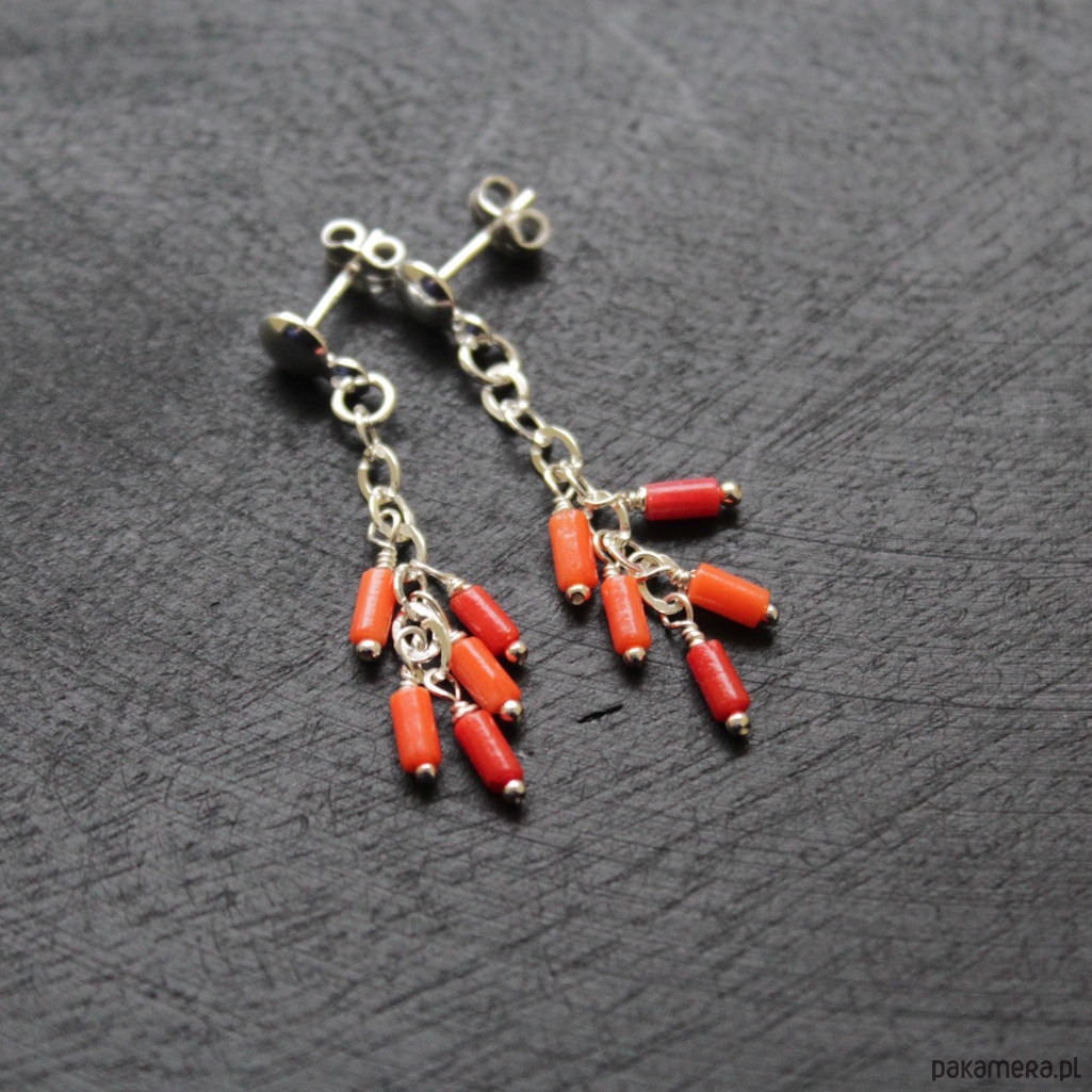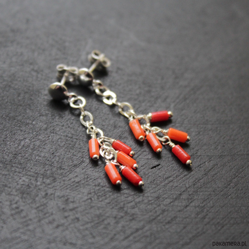 Delikatne kolczyki wykonane zostały ze srebra próby 925 oraz pomarańczowych i czerwonych korali.