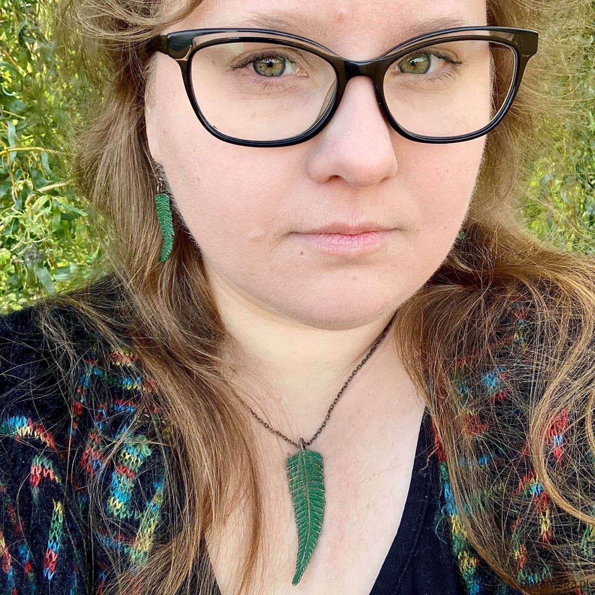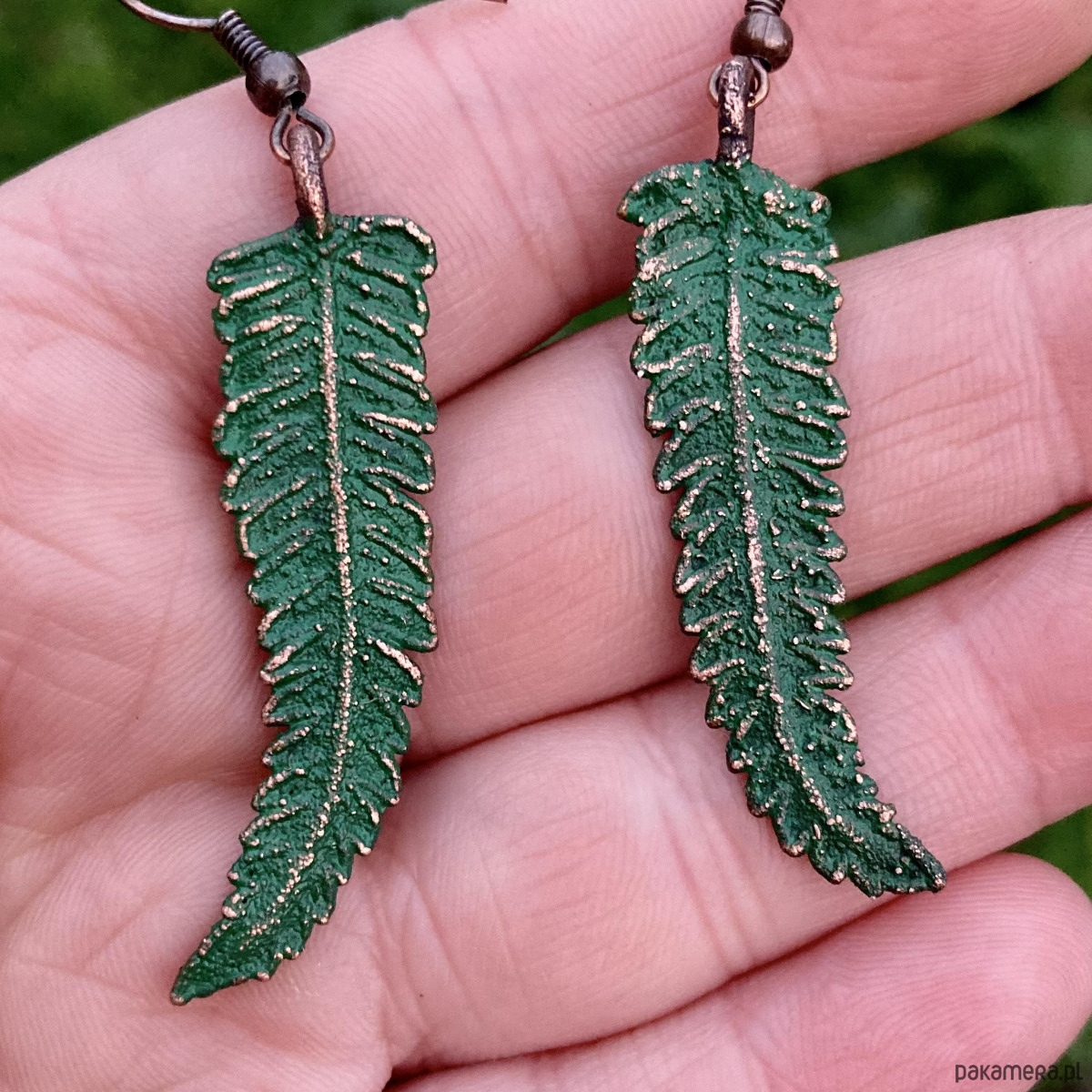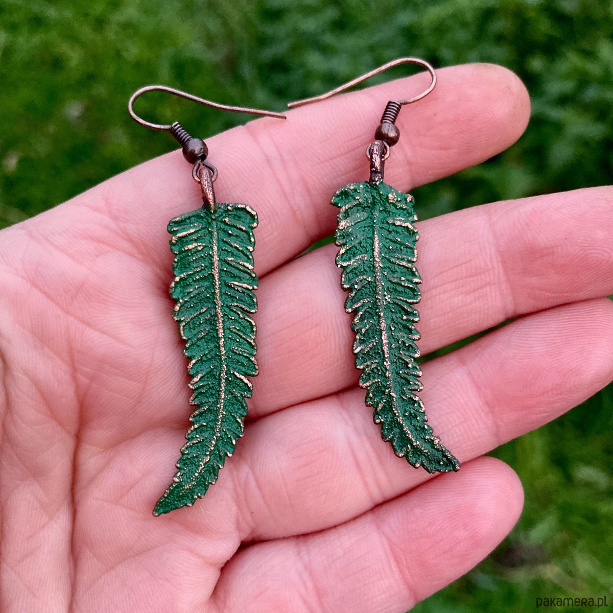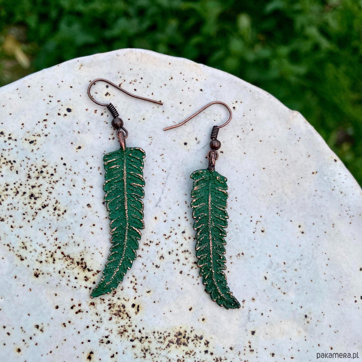 Organiczne, ręcznie wykonane kolczyki z liści paproci pokrytego miedzią.