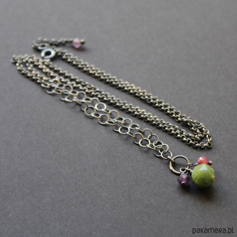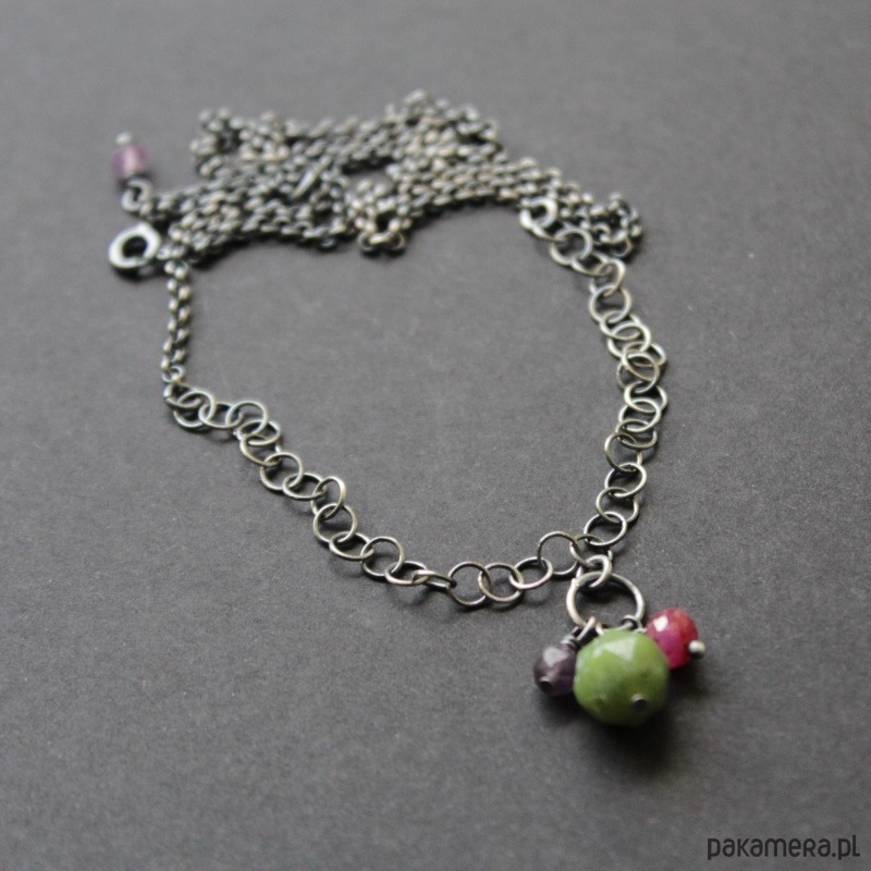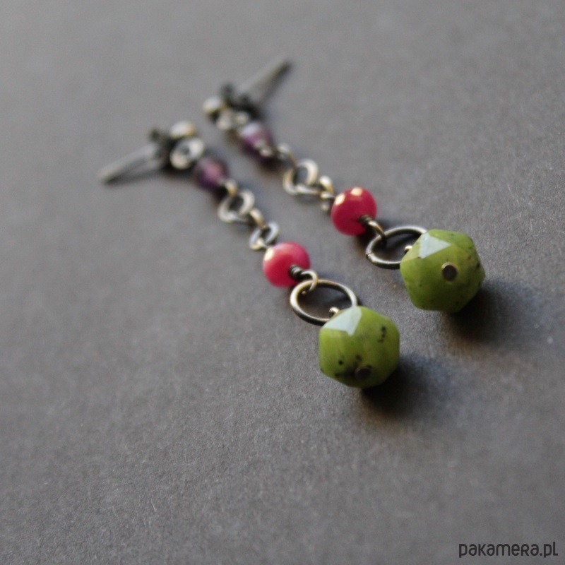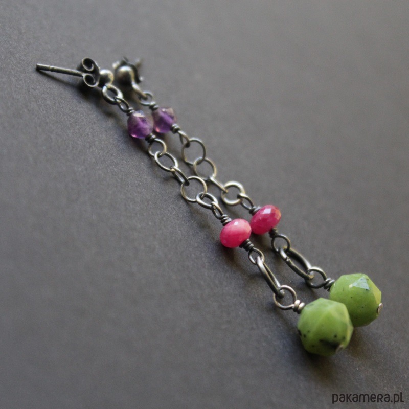 Przepiękne kolczyki wykonane zostały z oksydowanego srebra próby 925 oraz niezwykłych, kolorowych minerałów: bryłki nefrytu 0,8 cm, fasetowanej oponki rubiny klasy AAA (0,4 cm) oraz fasetowanego ametystu (0,5 cm).