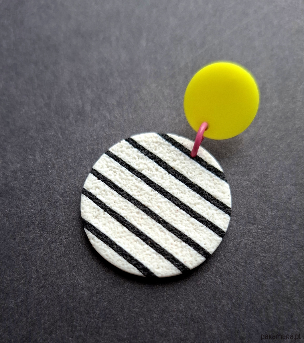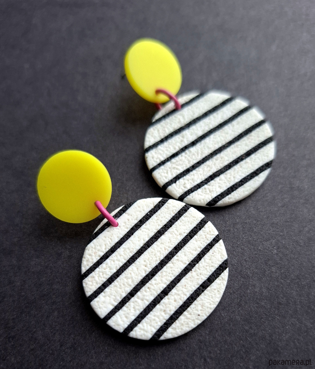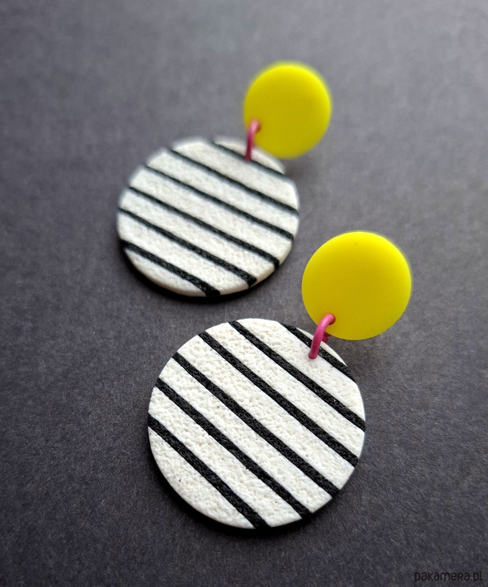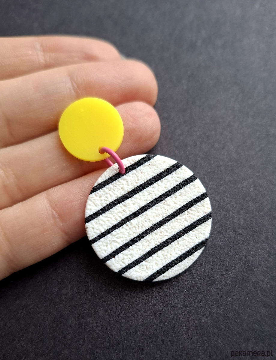 Lekkie, minimalistyczne sztyfty wykonane z wysokiej jakości glinki polimerowej z dodatkiem ozdobnych elementów akrylowych. Sztyfty posrebrzane i nieuczulające. Wymiary kolczyków: długość całkowita: 4,8 cm, szerokość max. 3 cm.