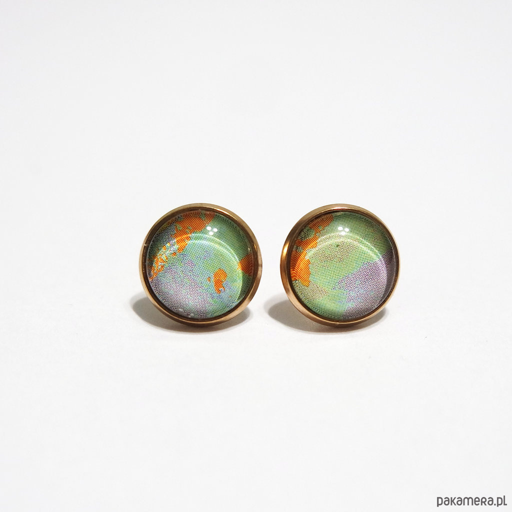 Grafika ukryta w prostych, eterycznych kolczykach, pod osłoną przeźroczystego półokrągłego szkiełka.
