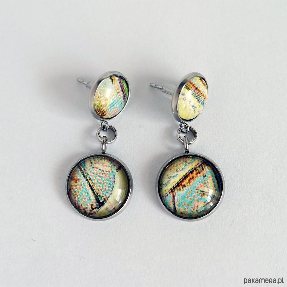 Grafika zamknięta w oryginalnych kolczykach, pod osłoną przeźroczystego półokrągłego szkiełka.
