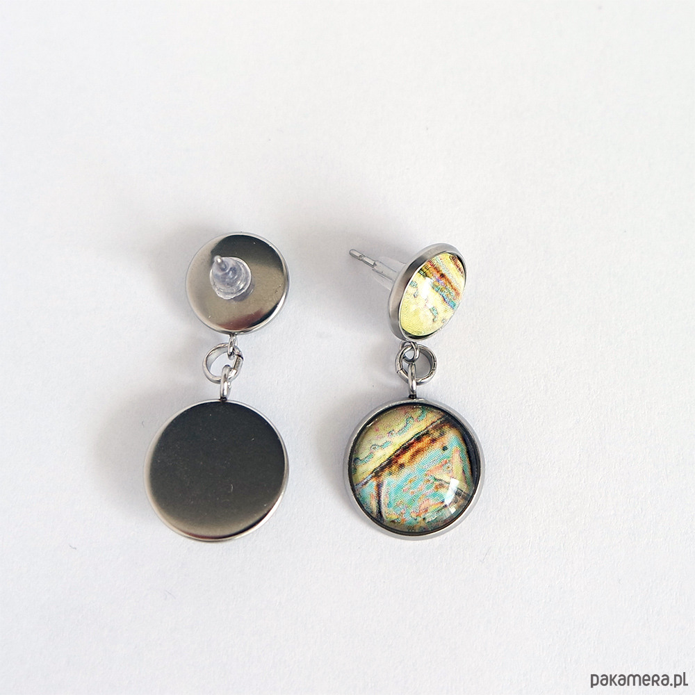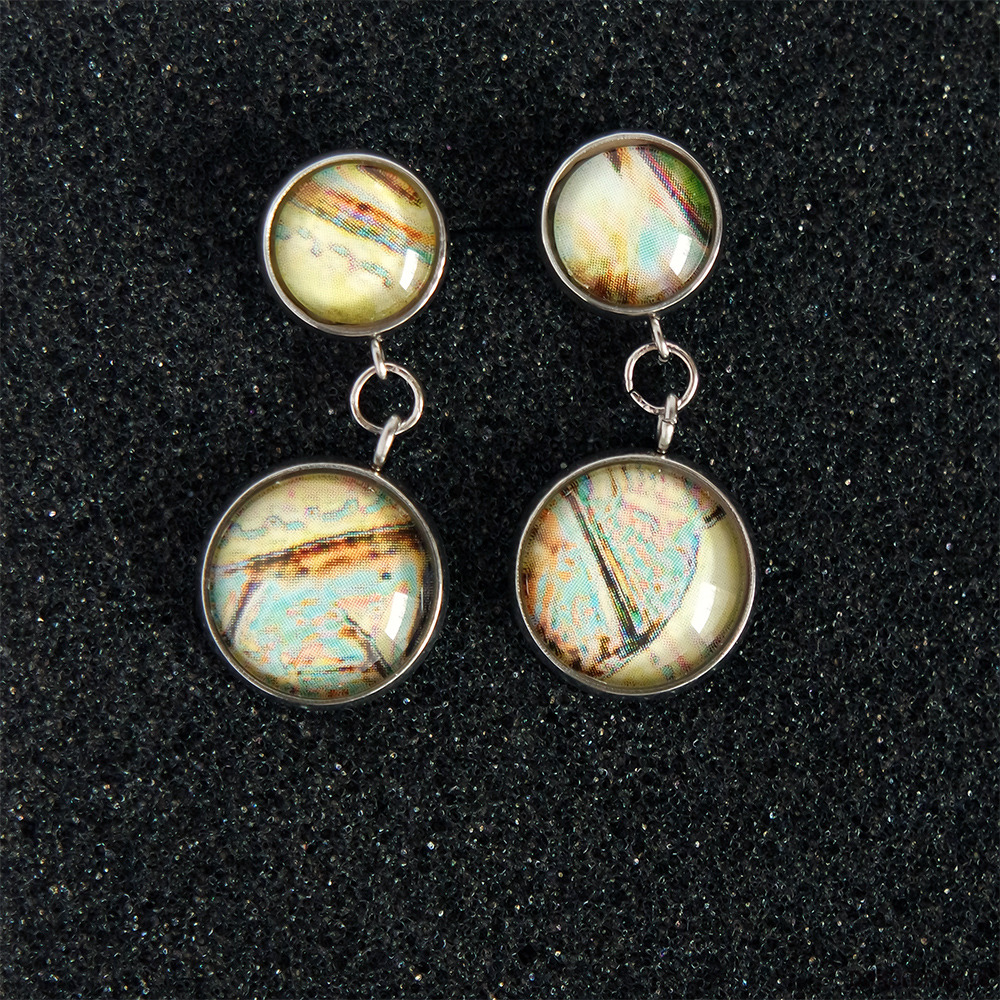 Grafika zamknięta w oryginalnych kolczykach, pod osłoną przeźroczystego półokrągłego szkiełka.