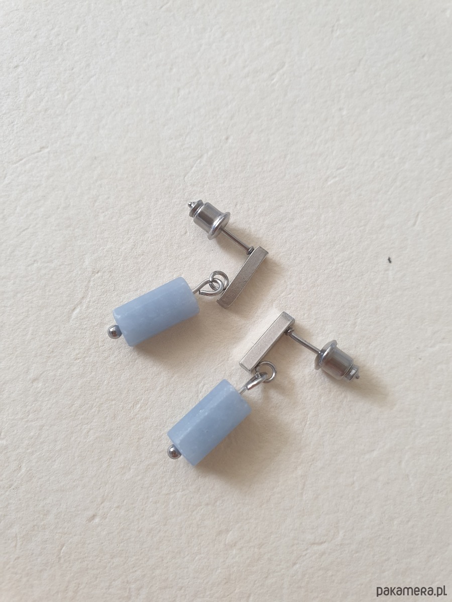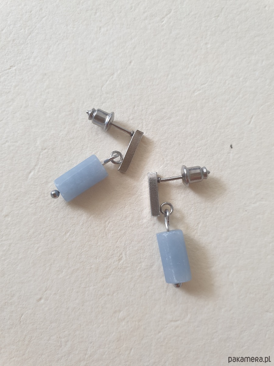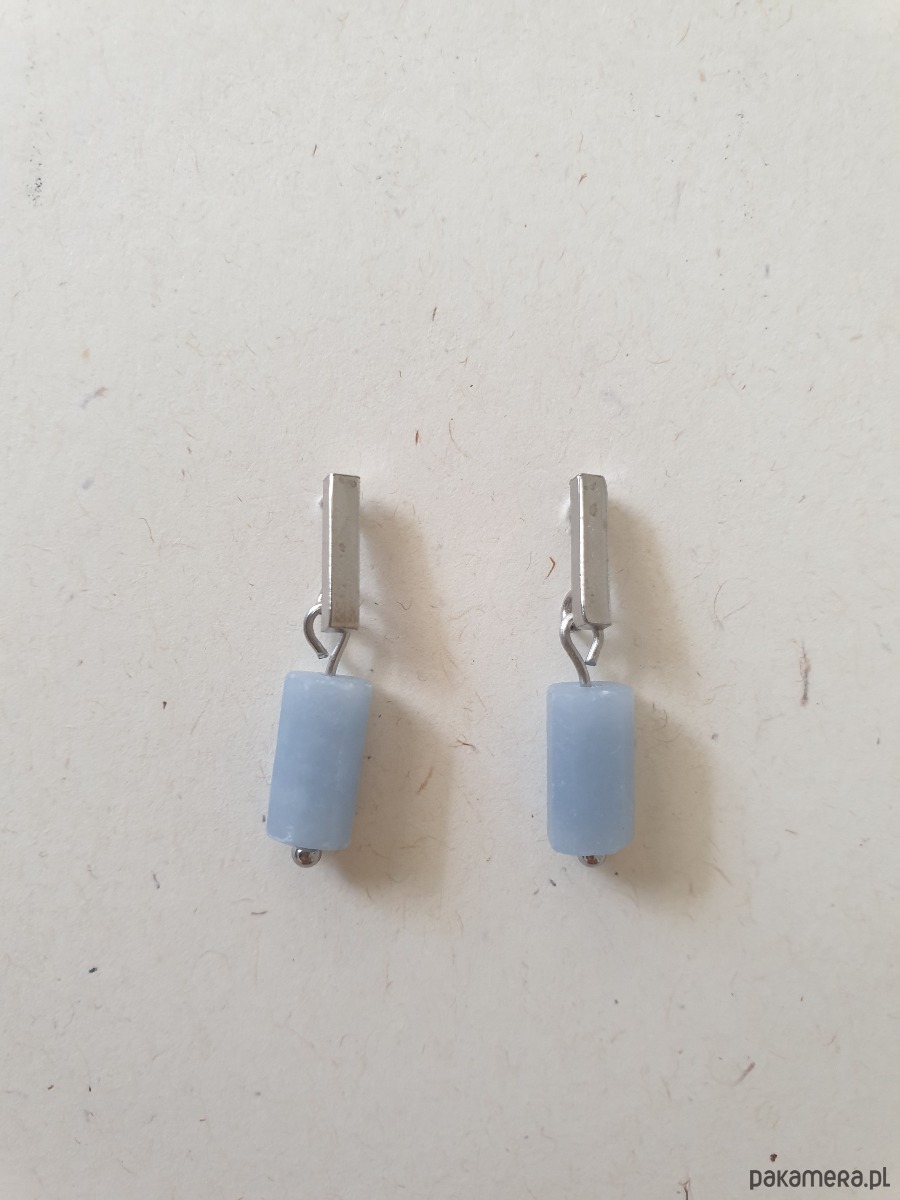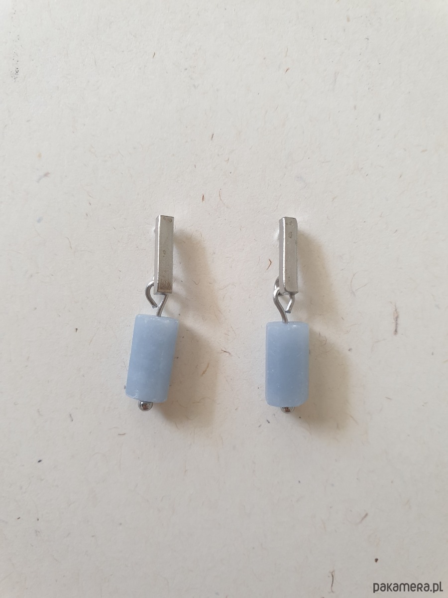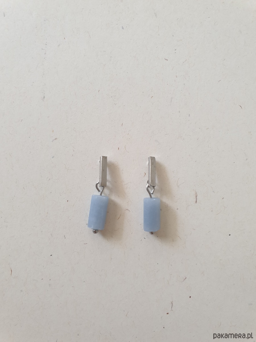 Drobne kolczyk PATYCZKI z kamieniem walcem- angelit, idealne na wieczorne wyjście ale też na co dzień. Na zdjęciu przykładowa para, kolczyki które kupujesz będą się minimalnie różnić bo każdy kamień jest wyjątkowy, ale zachowany będzie ten sam kształt i kolor.