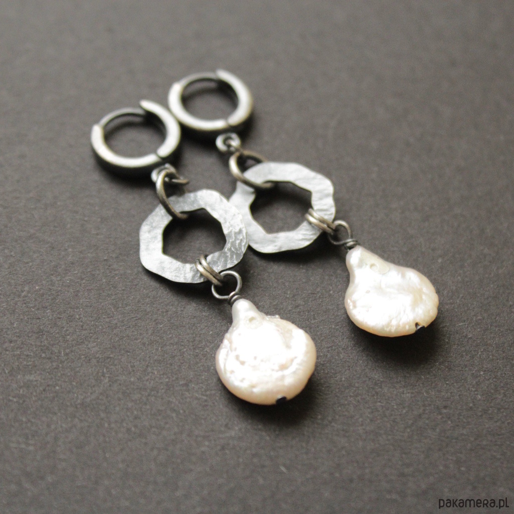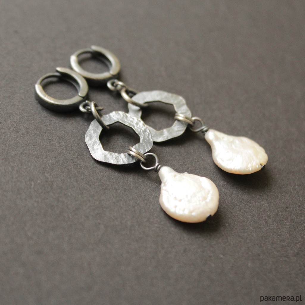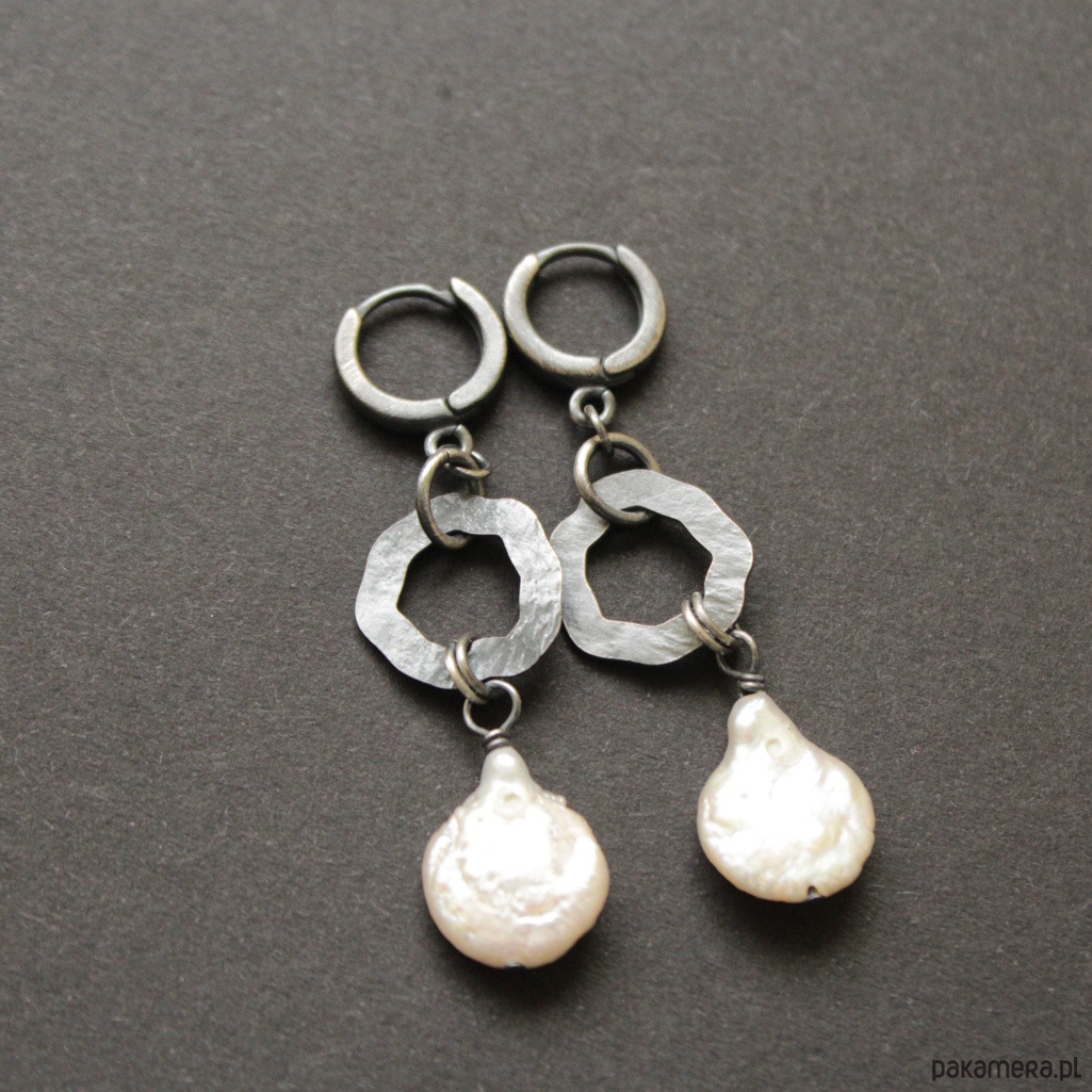 Kolczyki wykonane zostały z mocno oksydowanego srebra próby 925 oraz hodowlanych perełek wielkości 1,6 cm.