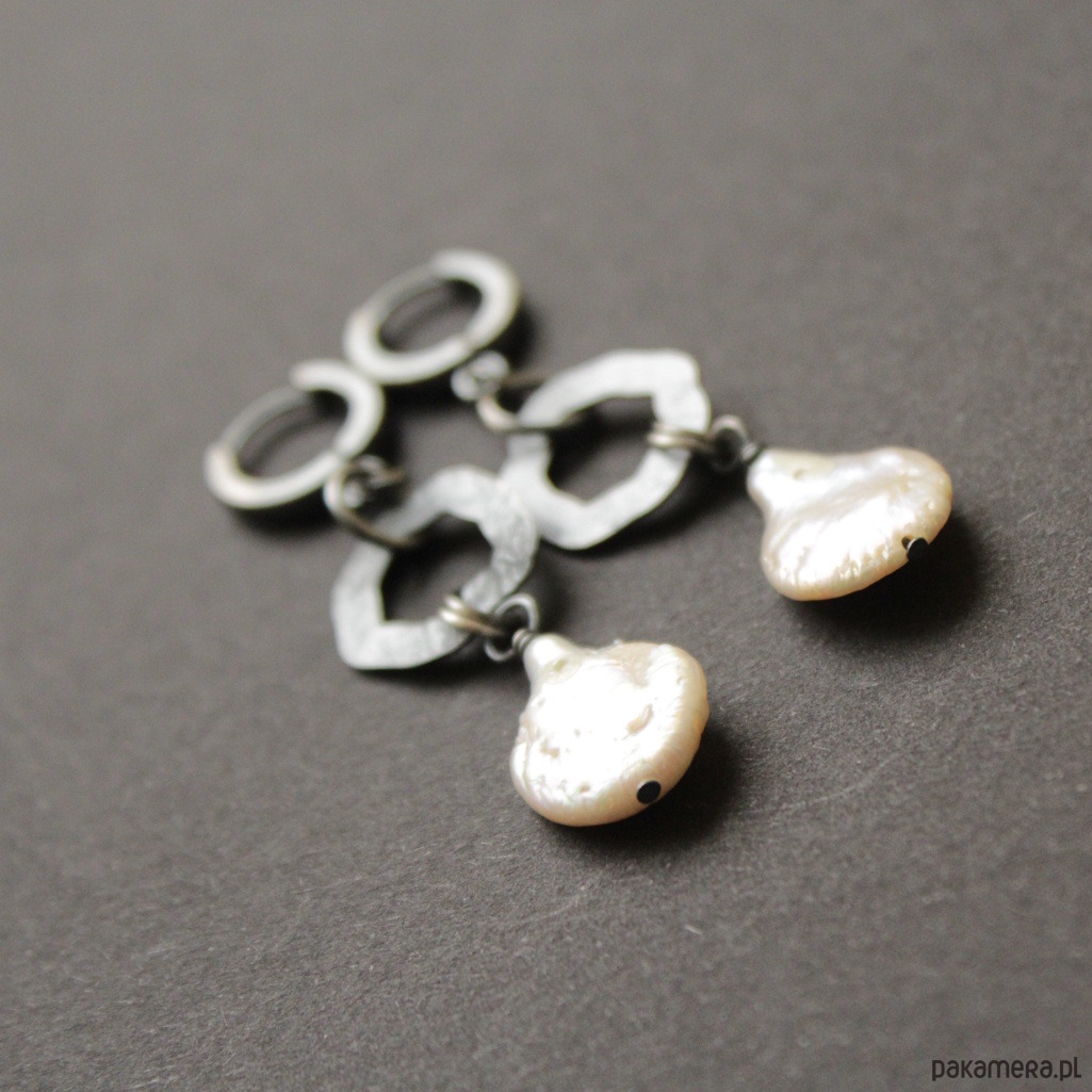 Perły zawieszone zostały na srebrnych młotkowanych biglach i nieregularnym owalu.