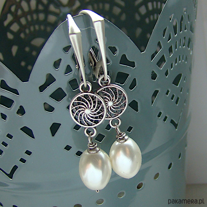 Eleganckie, kobiece kolczyki na co dzień i na specjalne okazje. Wykonane w całości z oksydowanego srebra próby 925 oraz naturalnych, białych pereł wielkości ok. 1cm. Długość całkowita to 4,5 cm. Bigle typu angielskiego. Ozdobnie zapakowane.
