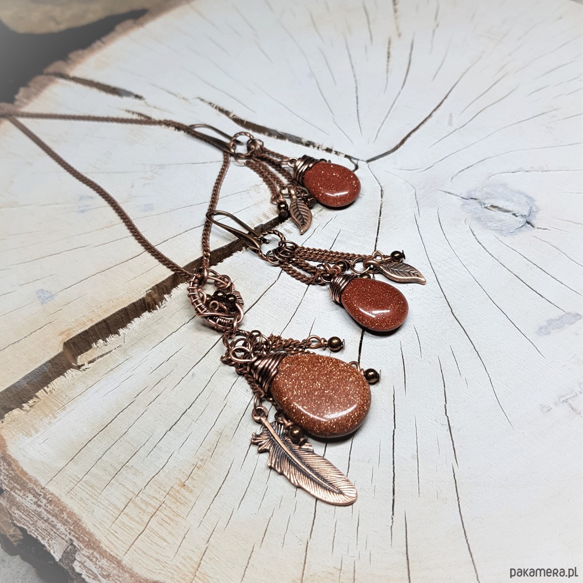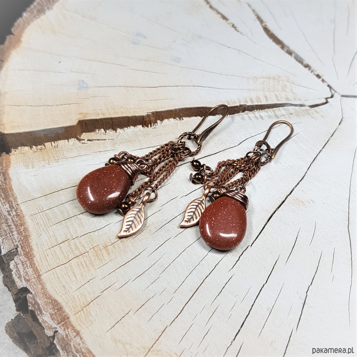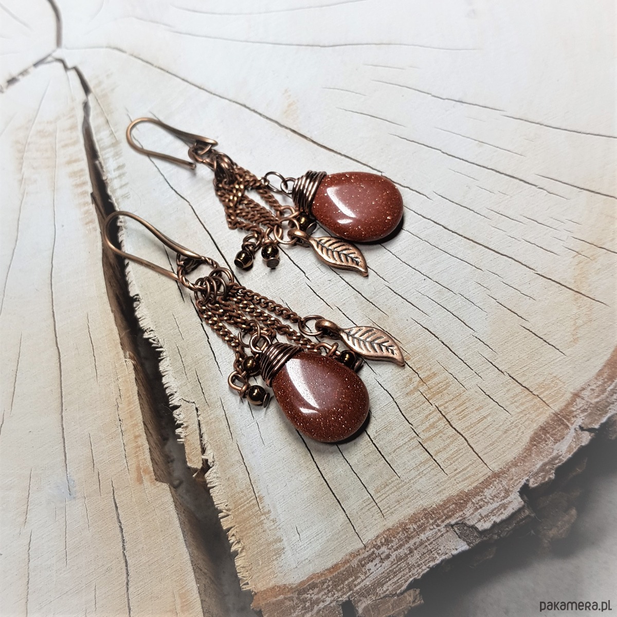 Kolczyki wykonane ręcznie w miedzi techniką wire-wrappingu z połyskujących złotymi drobinkami kropli rudego piasku pustyni. Długość kolczyków 61 mm.