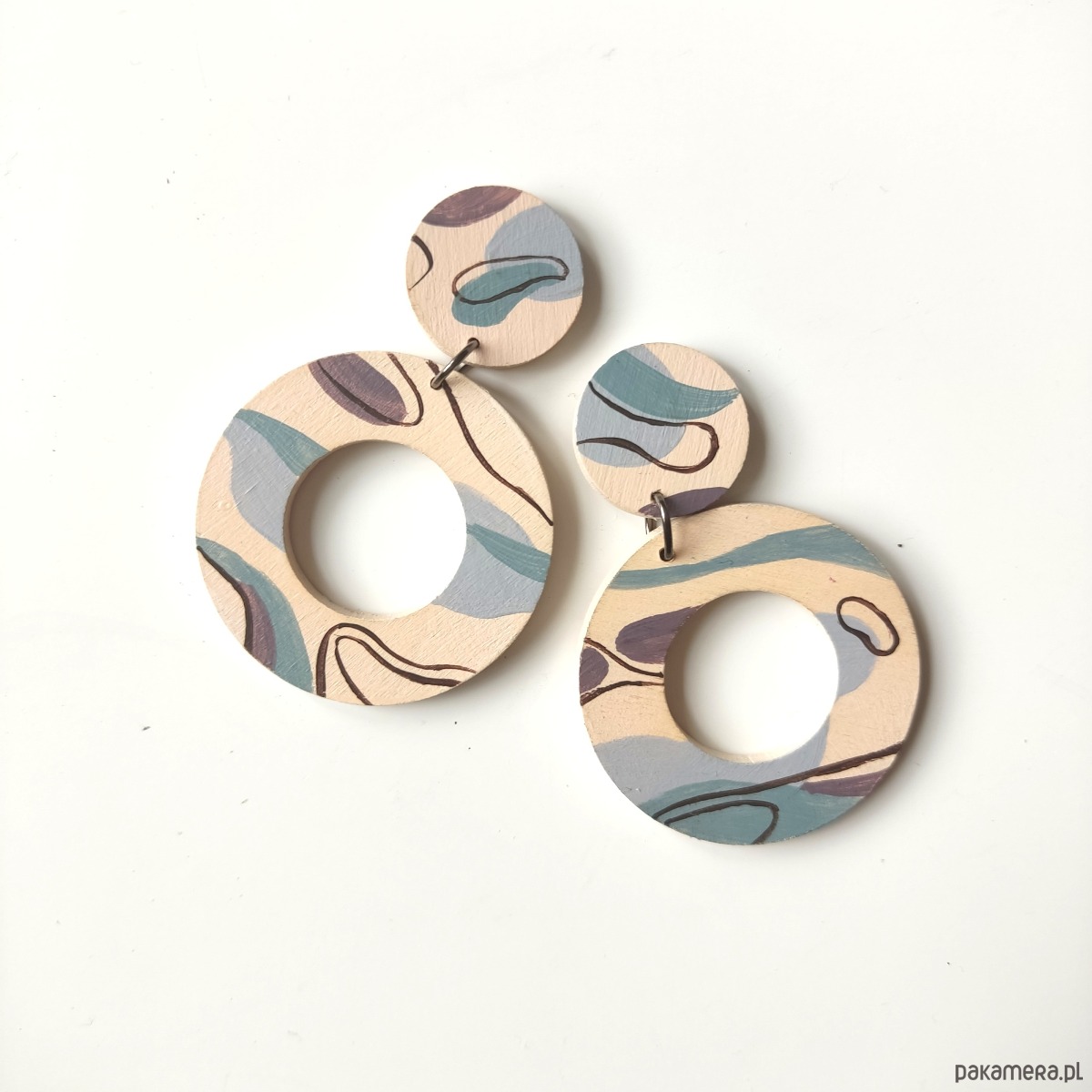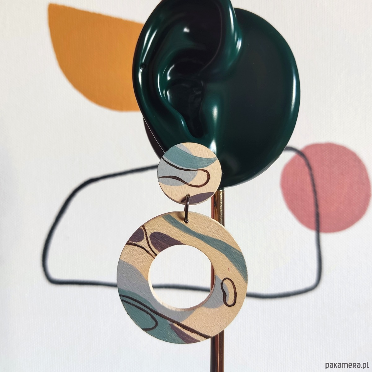 Kolczyki wykonane z drewna, bardzo lekkie; ręcznie malowane, sztyfty ze stali chirurgicznej. Każdy egzemplarz jest nieco inny.