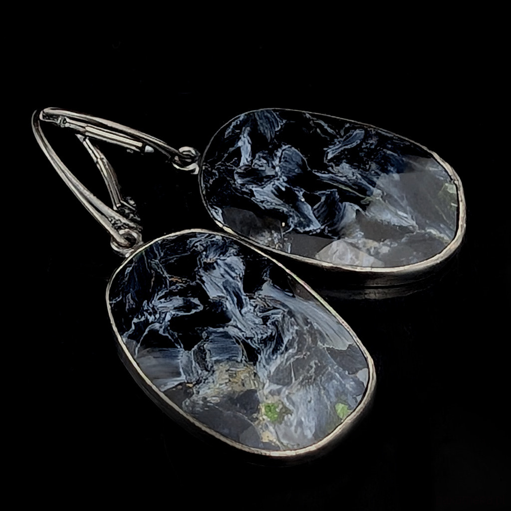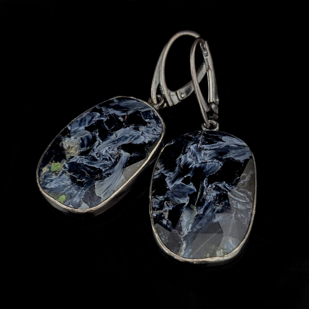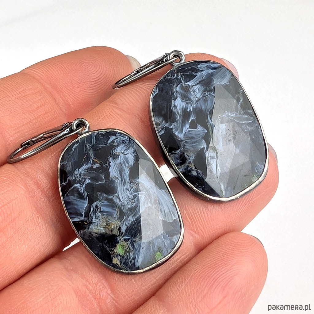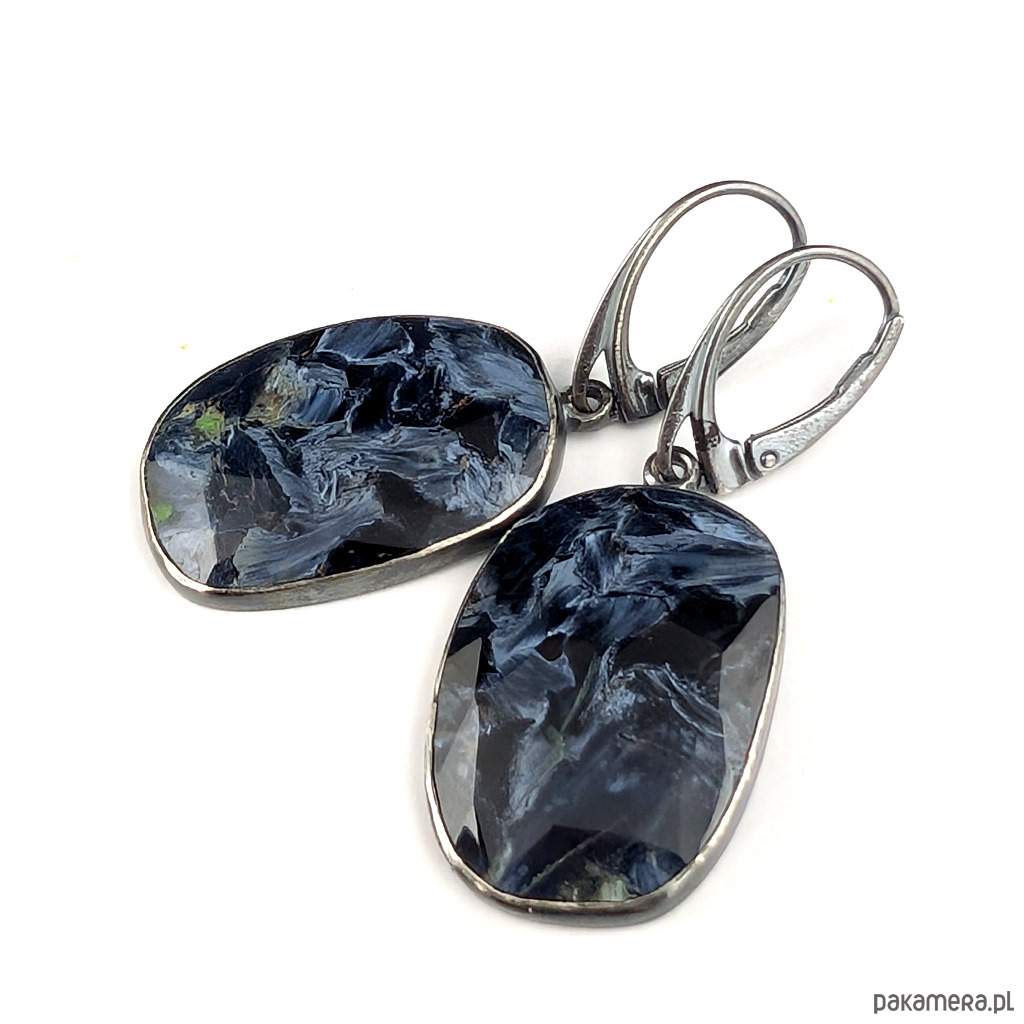 Oryginalne kolczyki z tajemniczym Pietersitem. Wykonane ze srebra, które zostało poddane zabiegowi oksydowania. Bardzo eleganckie i oryginalne. Długość kolczyka max.45 mm. Bigle angielskie. Kamienie mają oprawę 27 x 19 mm. Waga jednego kolczyka 5,5 g. Pietersite to rzadki, naturalny minerał o ciekawym efekcie tygrysiego oka. Piękna para zostanie wysłana w opakowaniu ozdobnym.