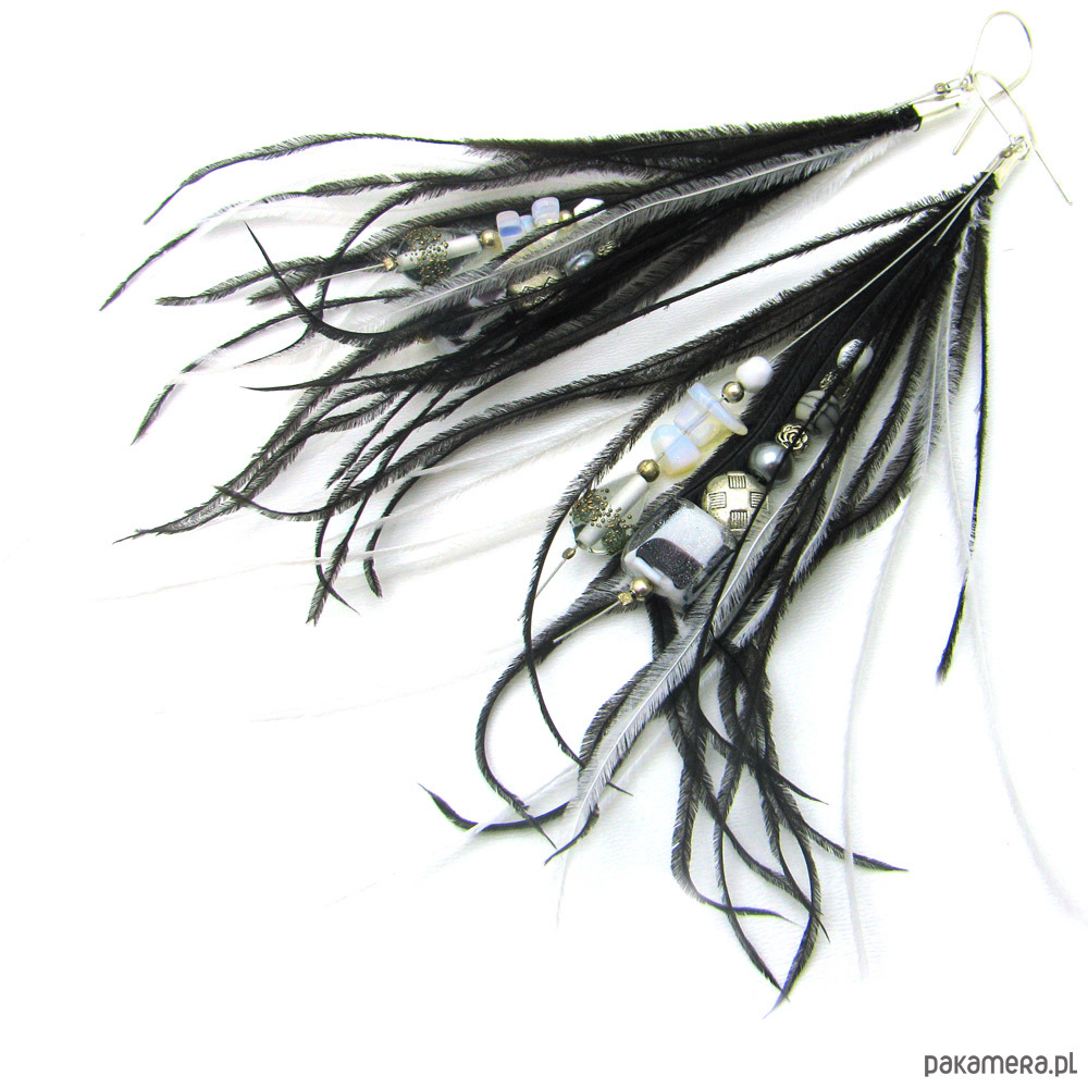Niezwykłe kolczyki wykonane z czarnych i białych piórek strusia. Materiały: piórka, korale szklane, korale naturalne, lampwork, korale opalu, szlifowane kryształki, srebrne bigle zgodne z normą EN1811 i EN12472 (BEZ NIKLU). Długość piór 16 cm, długość koralików 8 cm. Wszystkie kolczyki pakuję w bezpieczny sposób. POLECAM!!!
