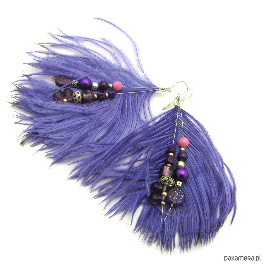 Niezwykłe kolczyki wykonane z końcówki pióra strusia. Pióra były własnoręcznie farbowane, więc mają unikatowy kolor chłodnego fioletu. Materiały: piórka, korale szklane, korale naturalne, lampwork, perły, srebrne bigle zgodne z normą EN1811 i EN12472 (BEZ NIKLU). Długość piór 9 cm, długość koralików 6 cm. Wszystkie kolczyki pakuję w bezpieczny sposób. POLECAM!!!