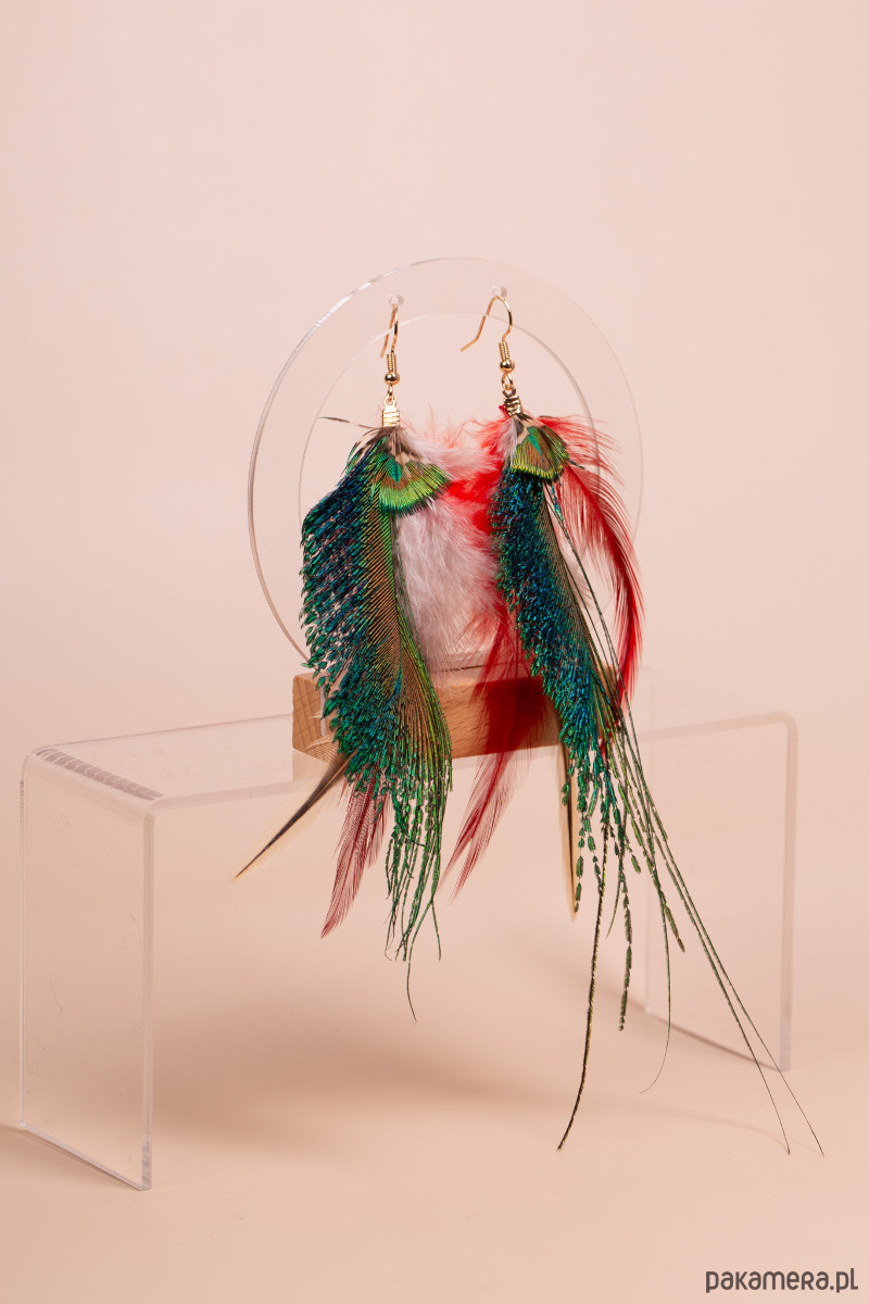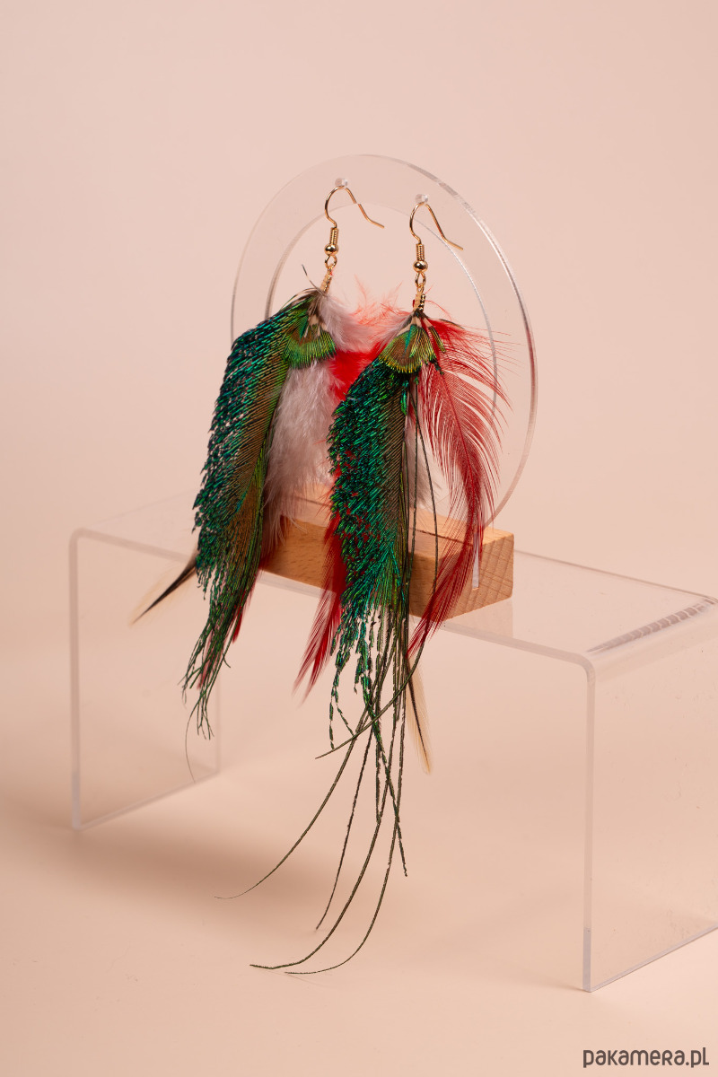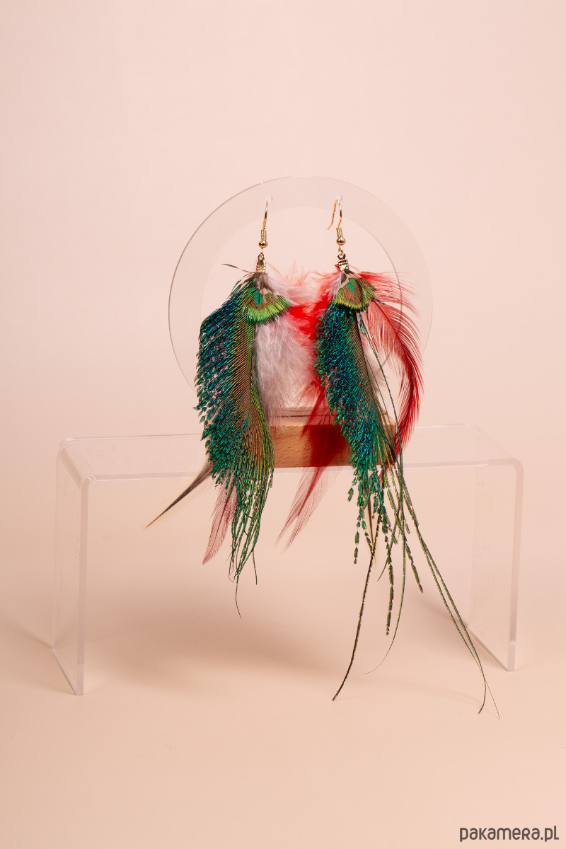 Kolczyki stworzone z naturalnych piór zachwycają swoją lekkością i żywą kolorystyką. Główną rolę odgrywają tu mieniące się, zielono-granatowe pióra o metalicznym połysku, które pięknie odbijają światło przy każdym ruchu. Towarzyszą im miękkie, puszyste piórka w bieli oraz intensywnej czerwieni - barwione dla uzyskania jeszcze bardziej wyrazistego efektu.
